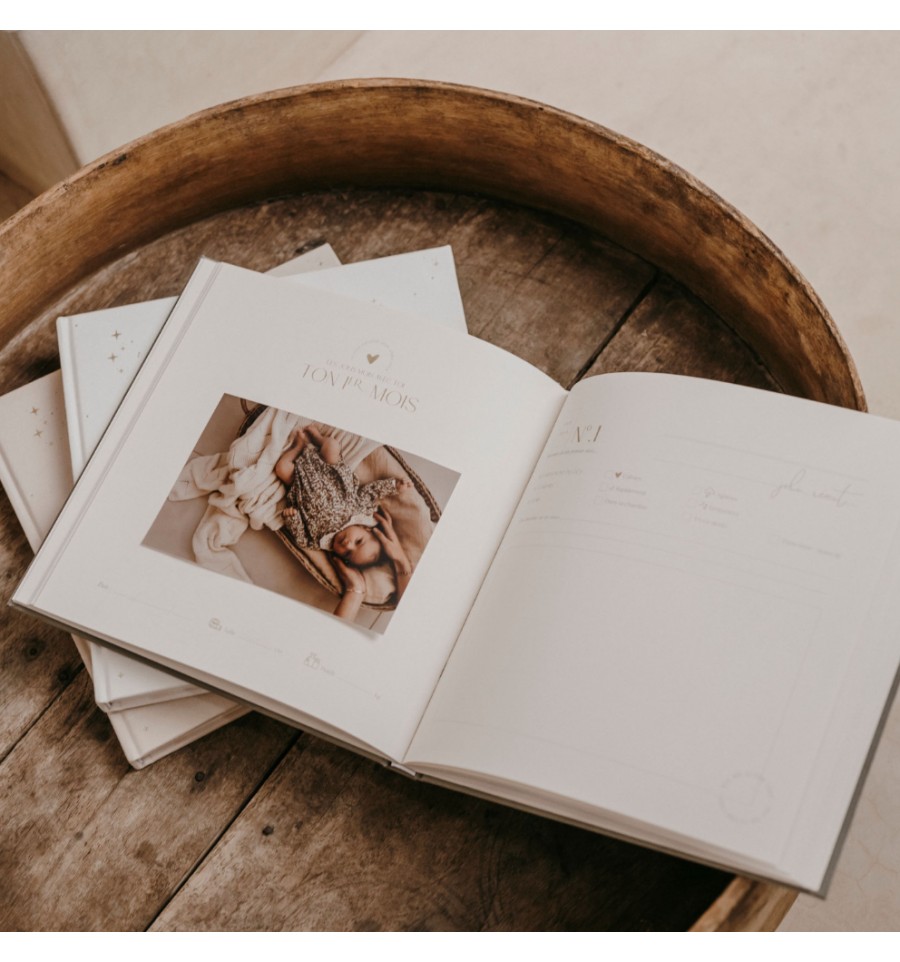 Ce joli livre couleur beige sera votre compagnon de grossesse et bien plus : vous pourrez y retracer absolument tout depuis le début, en passant par l'annonce jusqu'à la naissance de bébé, où vous immortaliserez l'histoire de ses premières fois et découvertes.