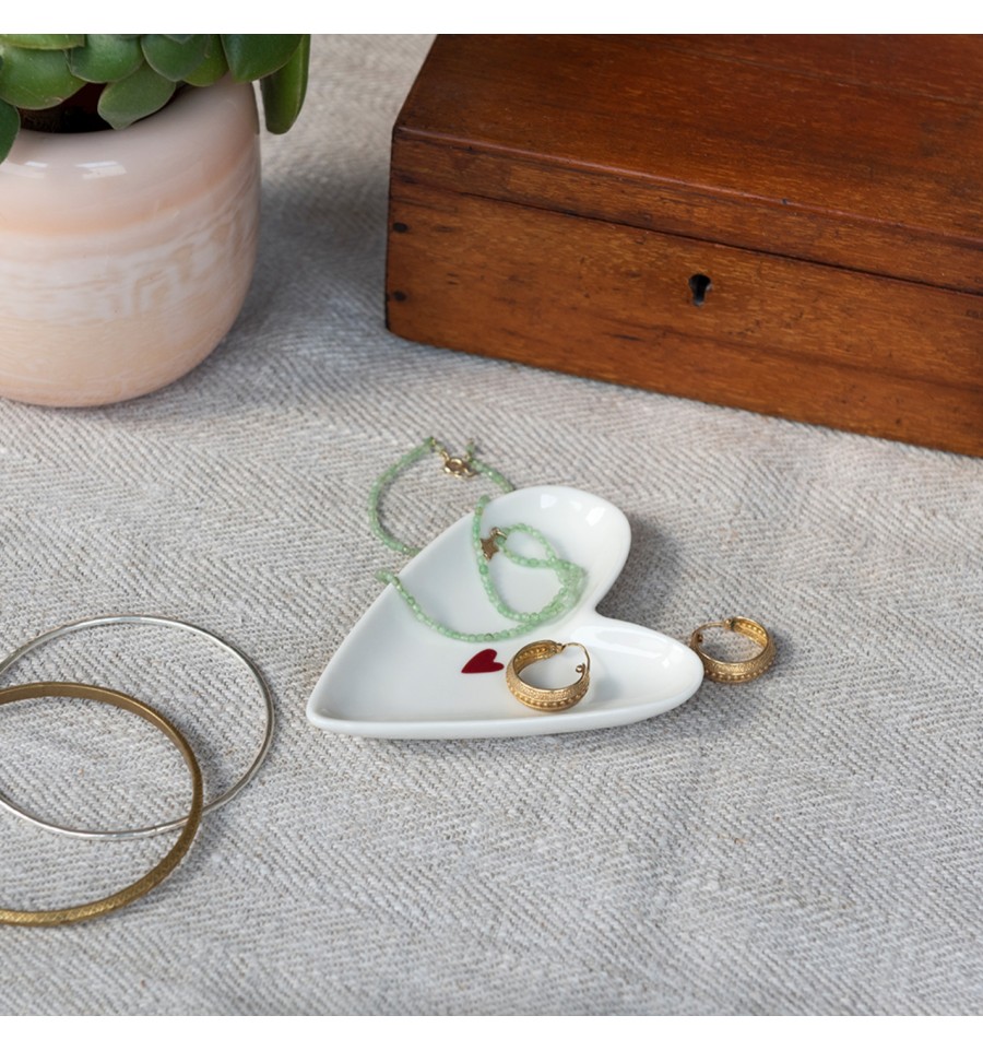 Jolie coupelle à bijoux en céramique, en forme de coeur et avec un petit coeur rouge imprimé au centre.