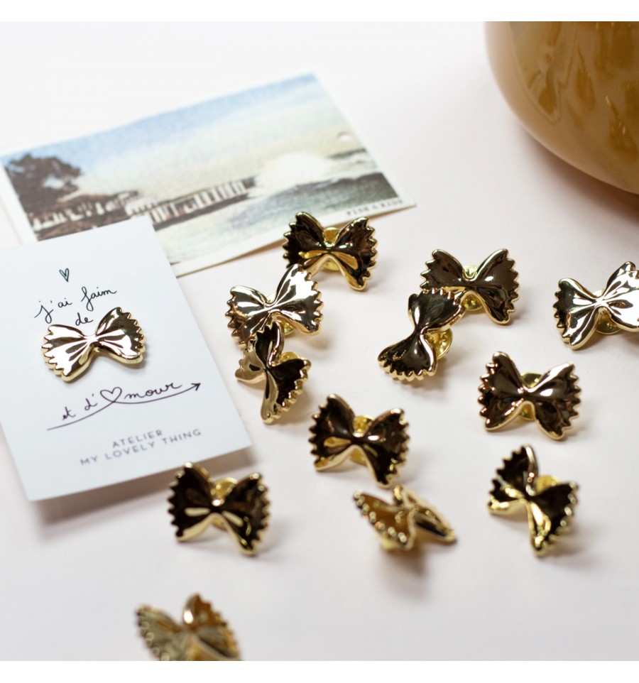 Customisez vos vêtements et autres sacs grâce à ce beau pin's en forme de farfalle (pâte en forme de papillon), à la finition dorée brillante !