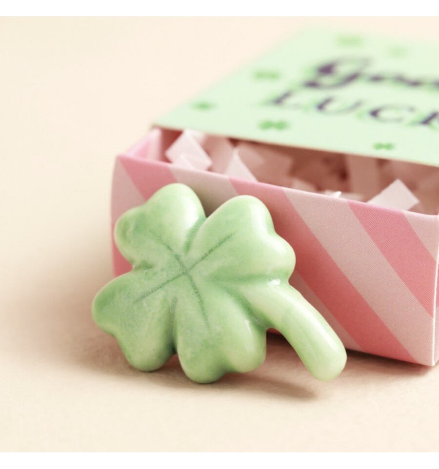 Cette jolie boîte verte cache un grigri en céramique en forme de trèfle à 4 feuilles.