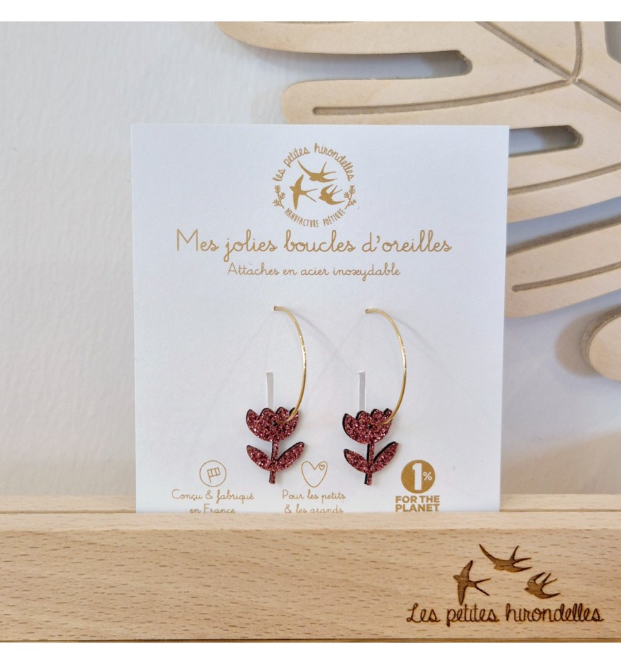 Ajoutez une touche de nature et de chic à votre style avec ces boucles d’oreilles créoles avec de jolies fleurs pailletées roses.