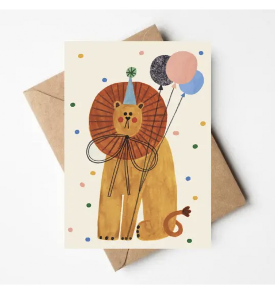 Cette carte double est fournie avec une enveloppe kraft. Dessus est dessiné un lion coiffé d'un chapeau et portant des ballons.