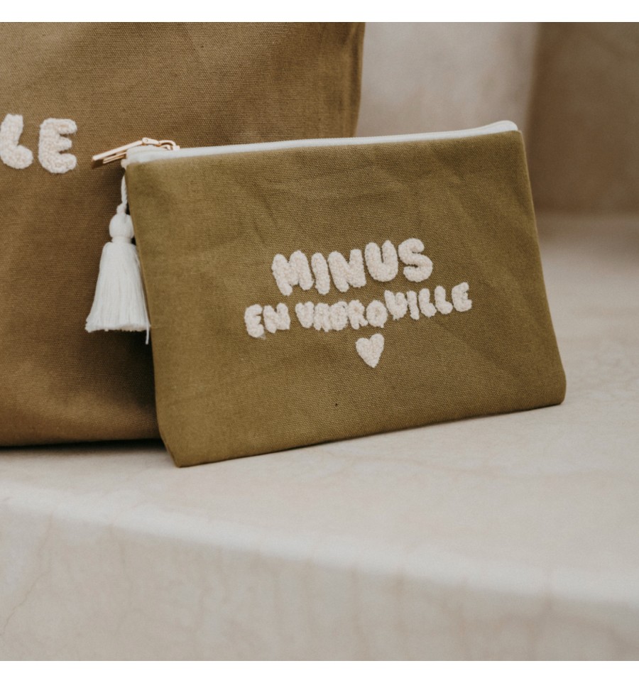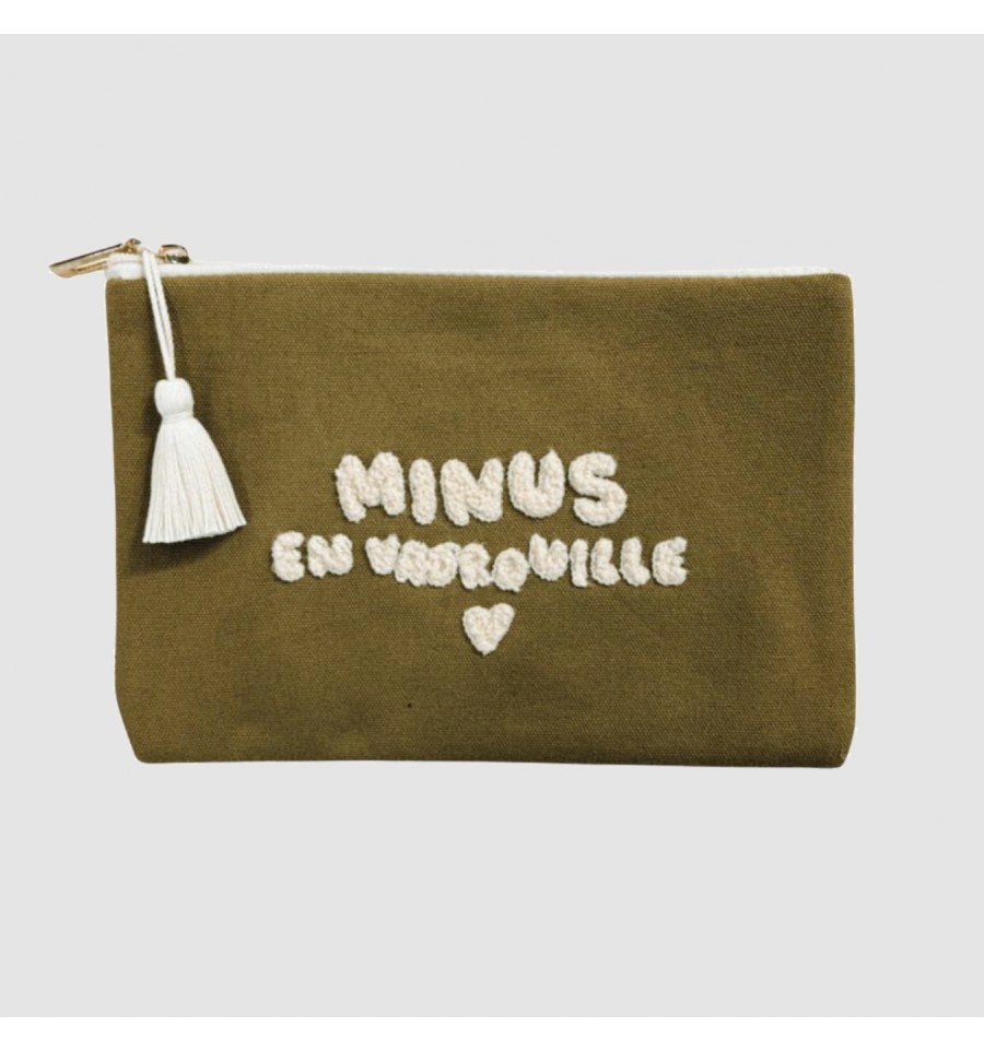 On adore sa couleurs verte, la broderie "minus en vadrouille" imitation mouton, son zip doré et son pompon amovible !