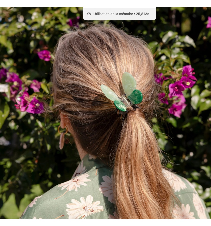 Ce papillon vert vif, aussi mignon qu’un vrai mais carrément plus pratique, vient agrémenter votre look avec une pincée de fantaisie printanière. Parfait pour dompter les mèches rebelles, illuminer un chignon ou donner l’illusion que vous êtes littéralement en connexion avec la nature (sans boue ni moustiques, on rassure).