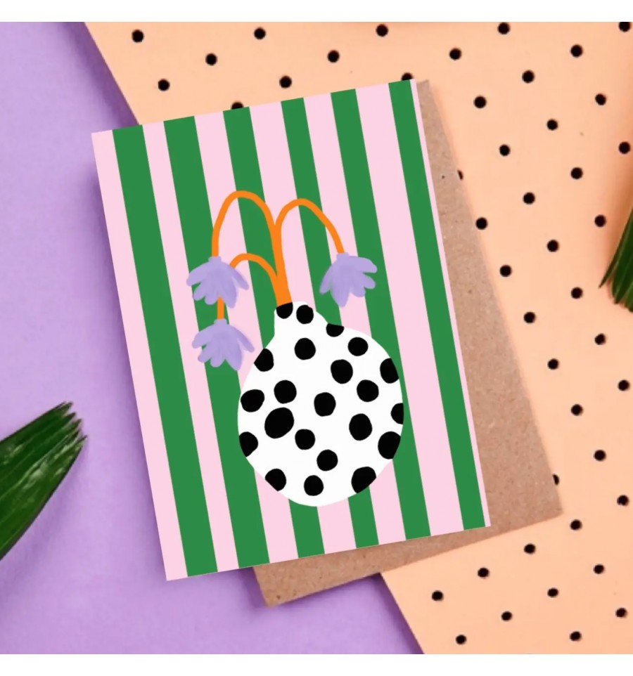 Cette carte colorée avec un vase à pois noirs sur fond à rayures vertes, plaira à coup sûr !