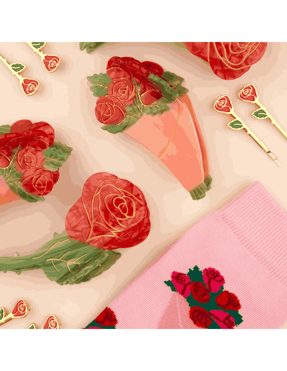 Cette jolie pince à cheveux en forme de rose rouge signée Coucou Suzette, fleure bon l'amour.