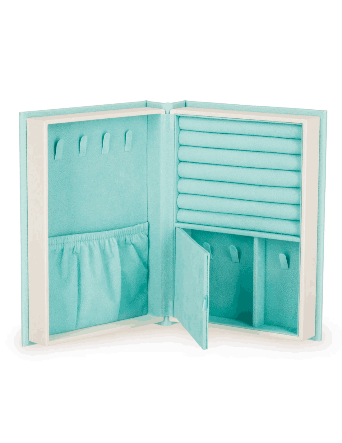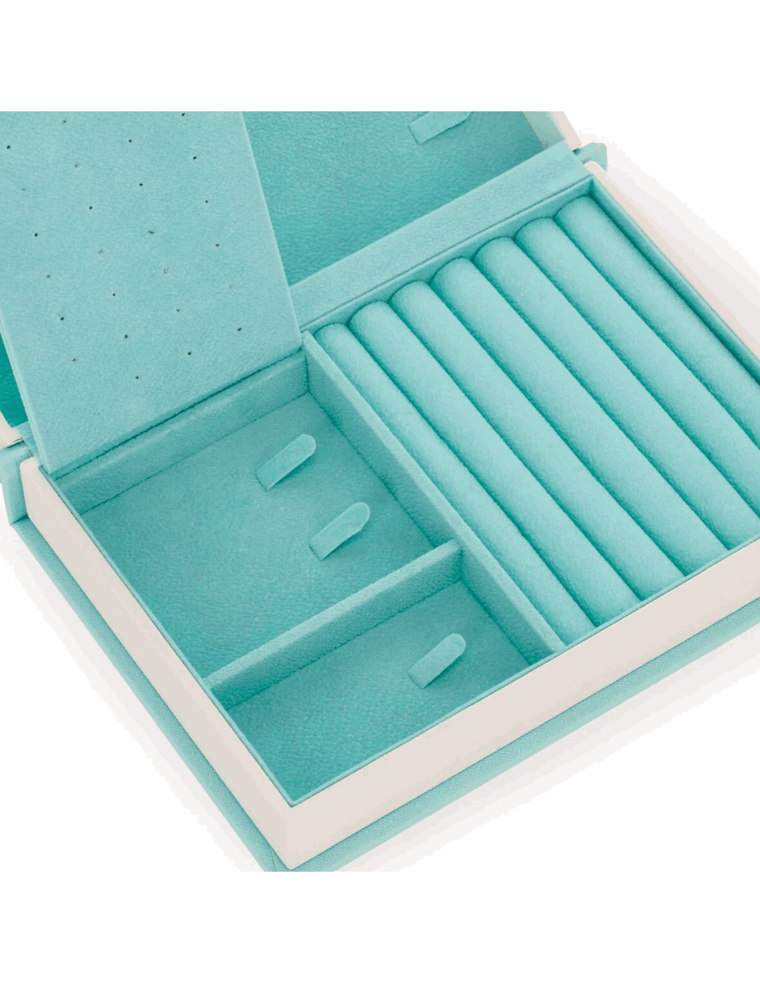 A l'intérieur retrouvez, 6 compartiments de rangement (couleur vert d'eau en suédine) : des rouleaux pour attacher vos bagues, des crochets pour suspendre vos bracelets et colliers, des trous pour fixer vos boucles d'oreilles, etc.... aucun bijou ne sera oublié.