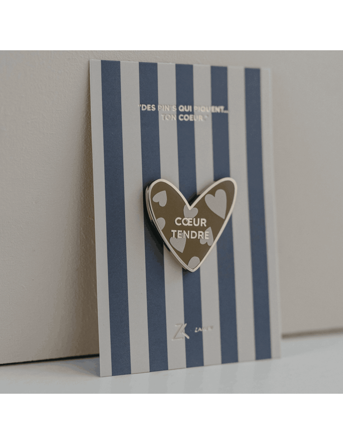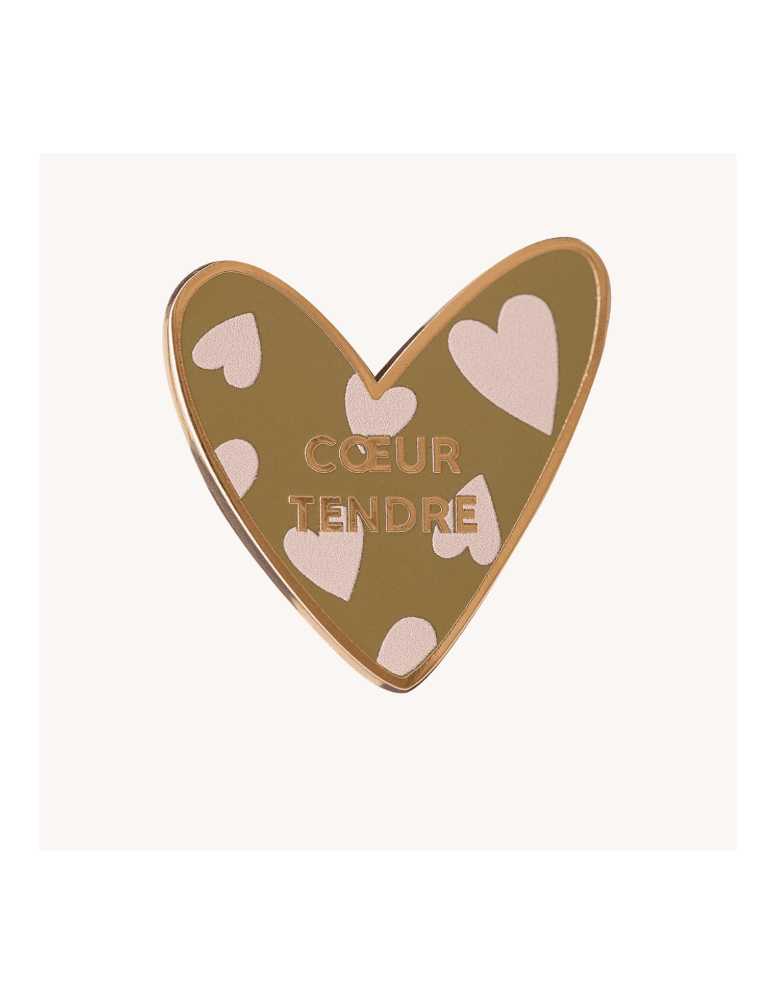 Ce pin's en forme de coeur est tapissé d'un fond couleur kaki avec des petits coeurs roses pales dessinés à l'intérieur. On retrouve également une inscription "Coeur tendre" dorée.