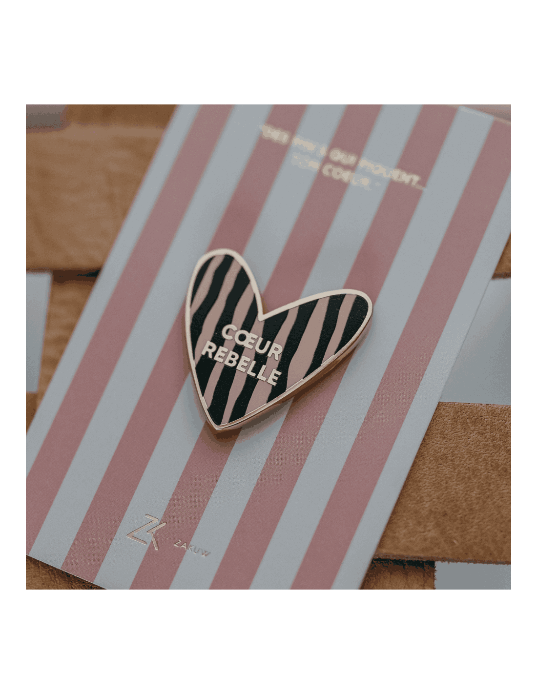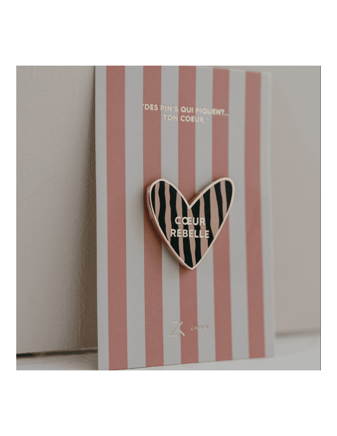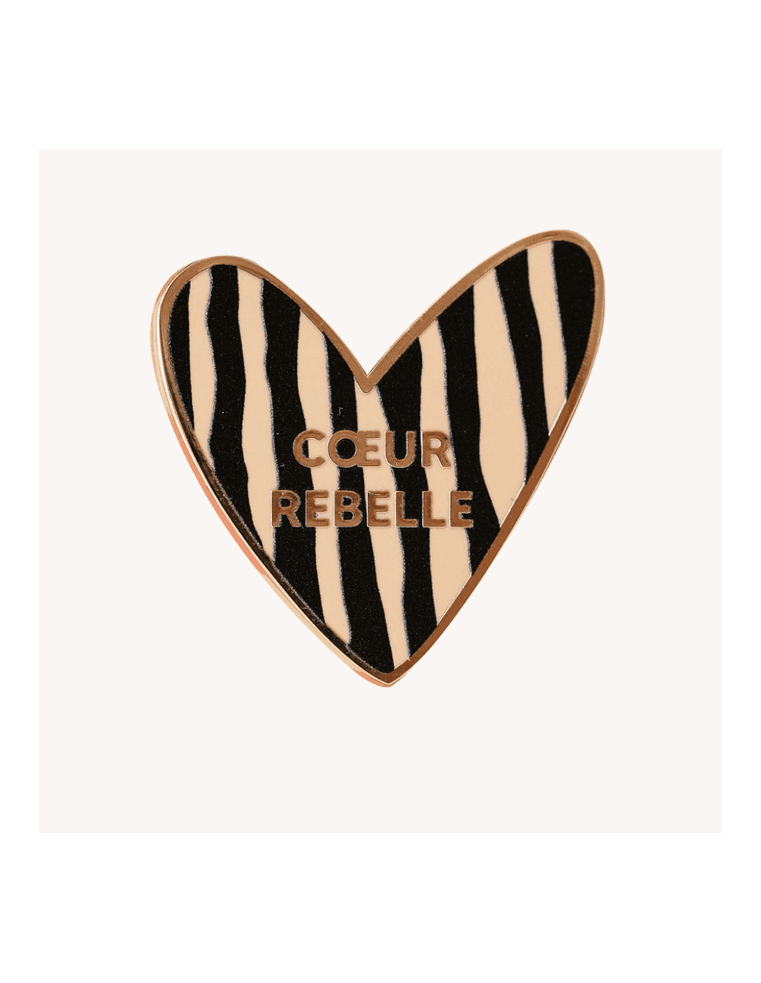 Ce pin's en forme de coeur est tapissé de zébrures avec l'inscription : "Coeur Rebelle".