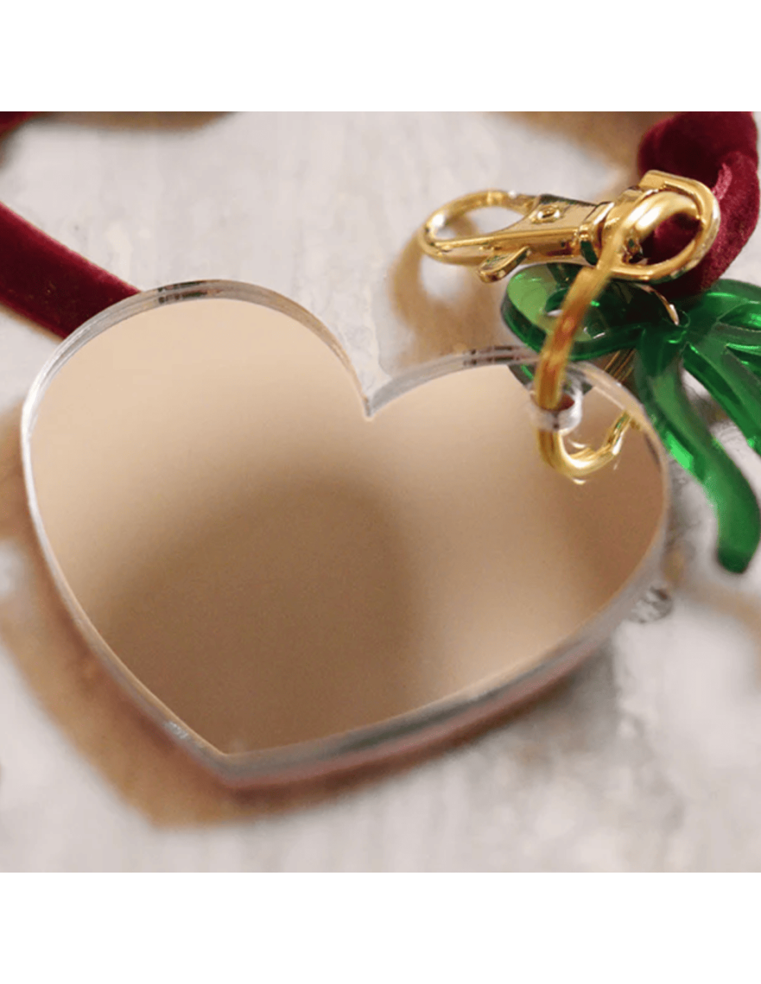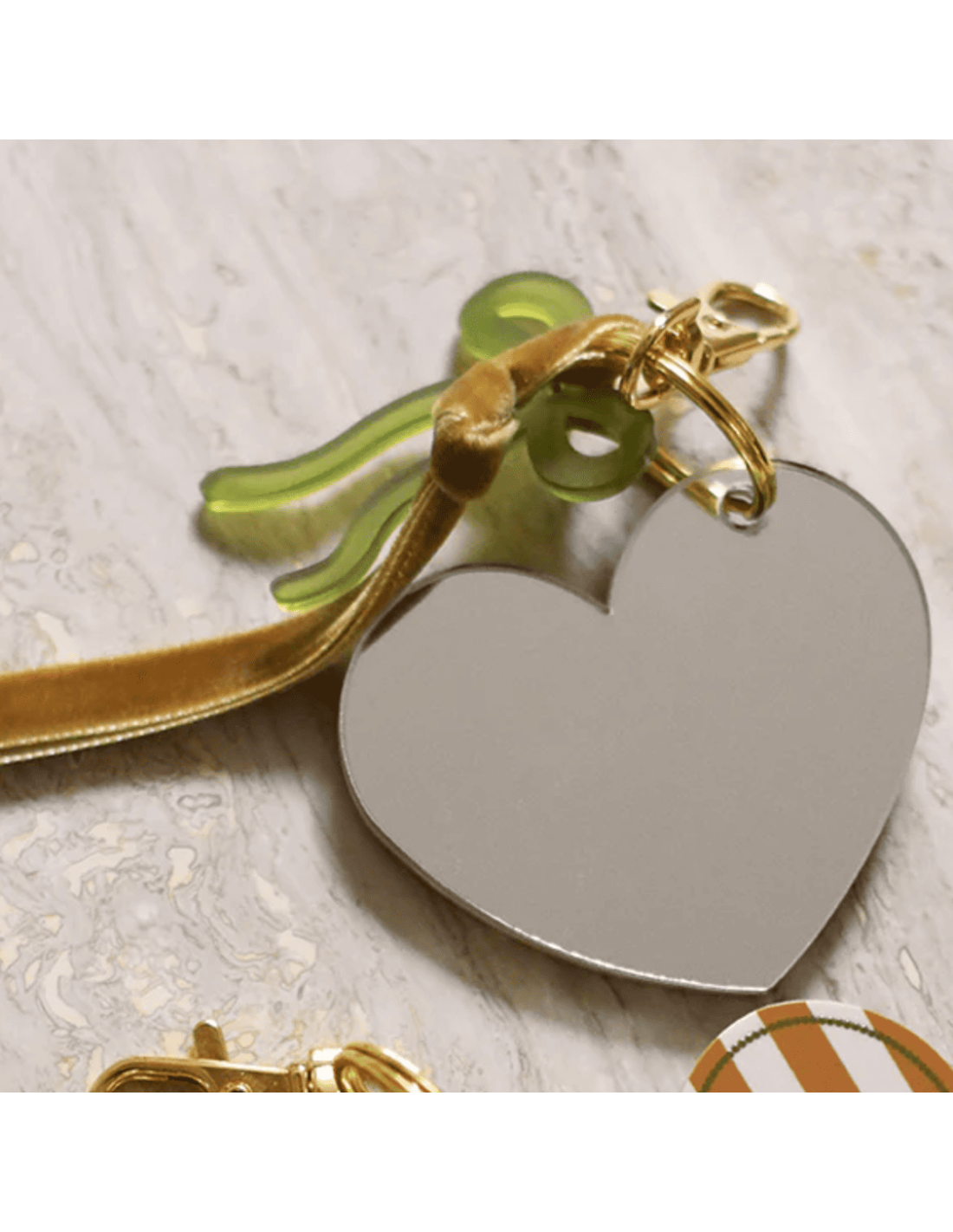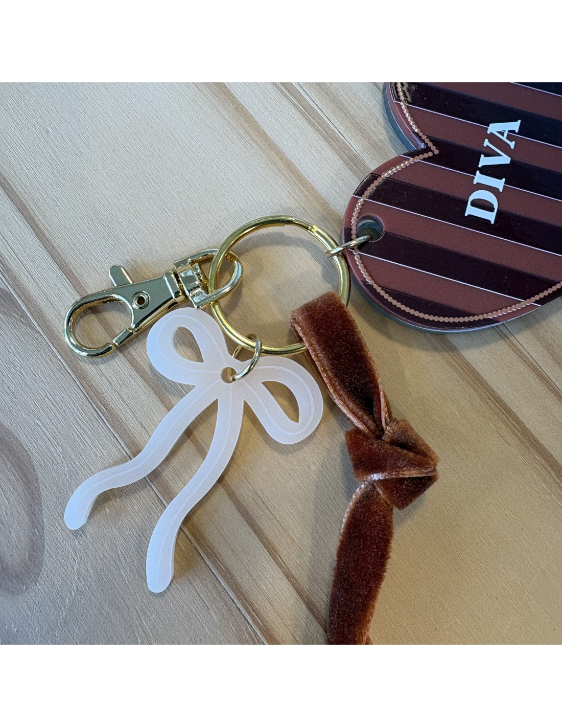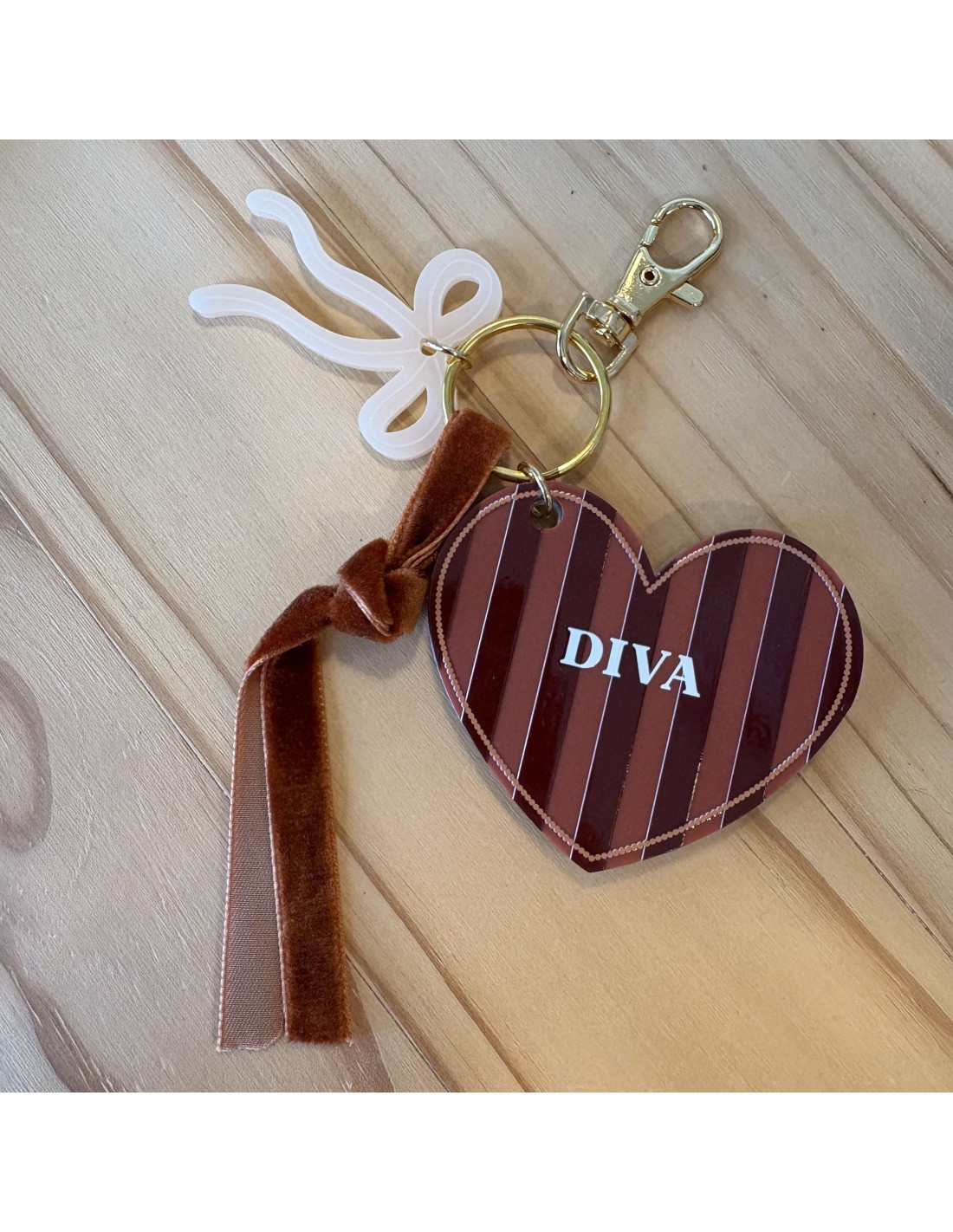 Le porte-clés cœur de la marque Les Mignonneries est élégant et féminin. Il est orné de bandes colorées dans les tons bordeaux et d’une inscription "Diva" sur le recto. Au verso, un miroir pratique pour les retouches du quotidien. Il est sublimé par une breloque en forme de nœud, un ruban en velours délicat et une attache dorée raffinée.