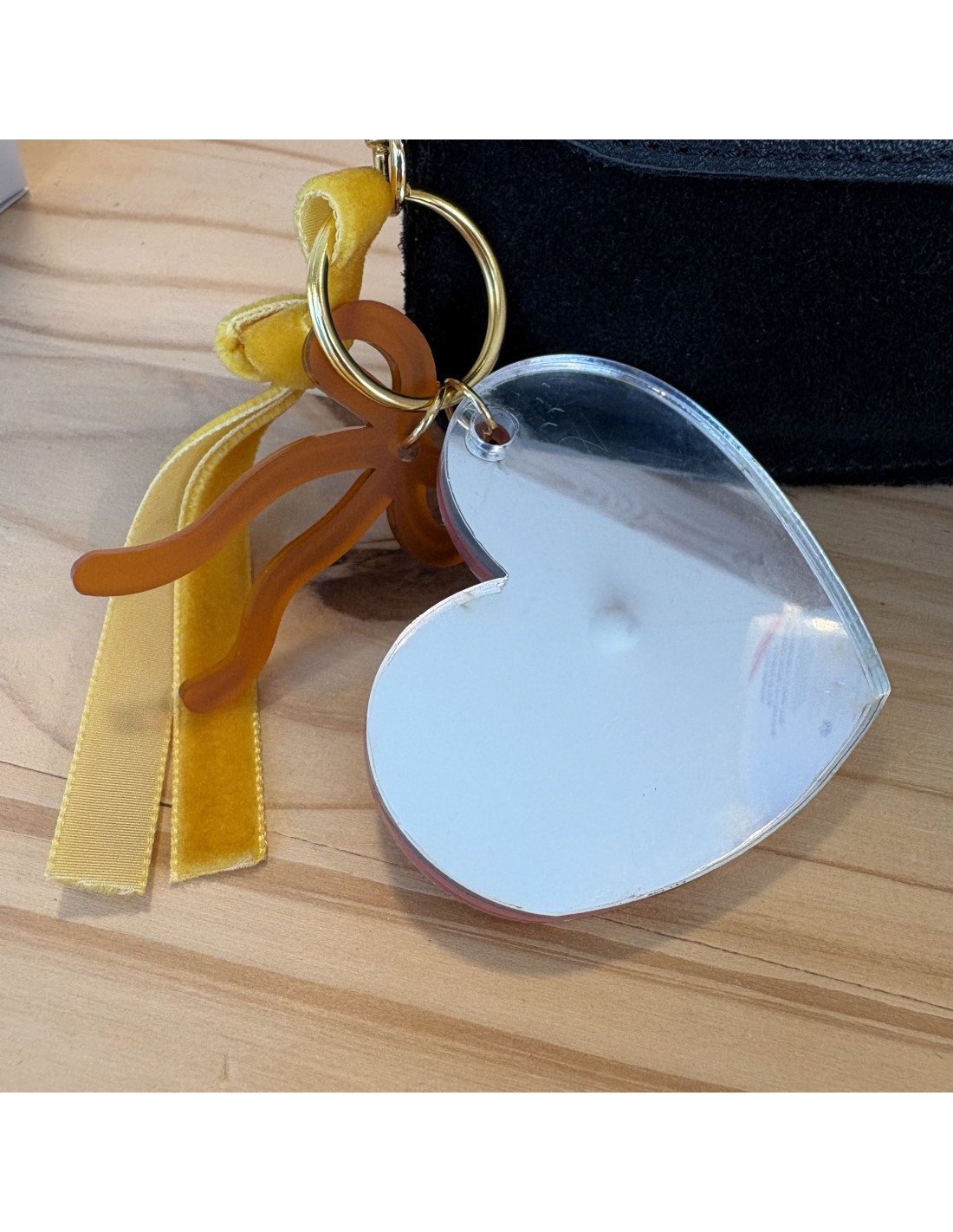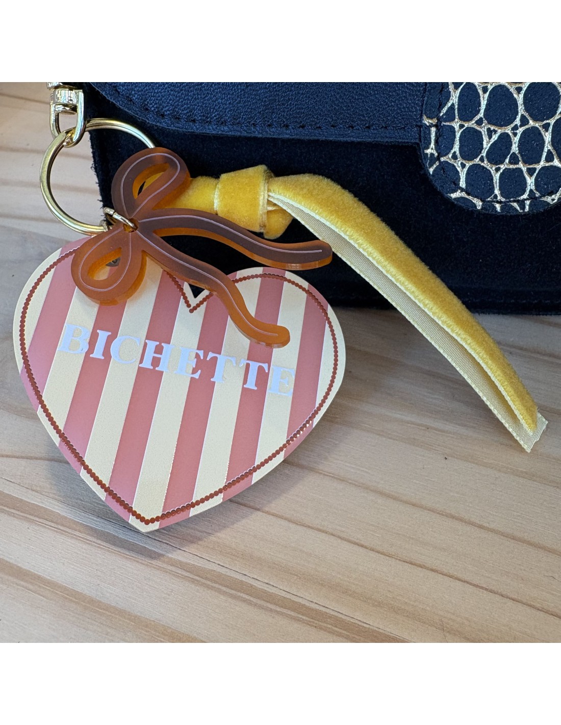 Le porte-clés cœur de la marque Les Mignonneries est élégant et féminin. Il est orné de bandes colorées dans les tons rose et jaune et d’une inscription "Bichette" sur le recto. Au verso, un miroir pratique pour les retouches du quotidien. Il est sublimé par une breloque en forme de nœud, un ruban en velours délicat et une attache dorée raffinée.