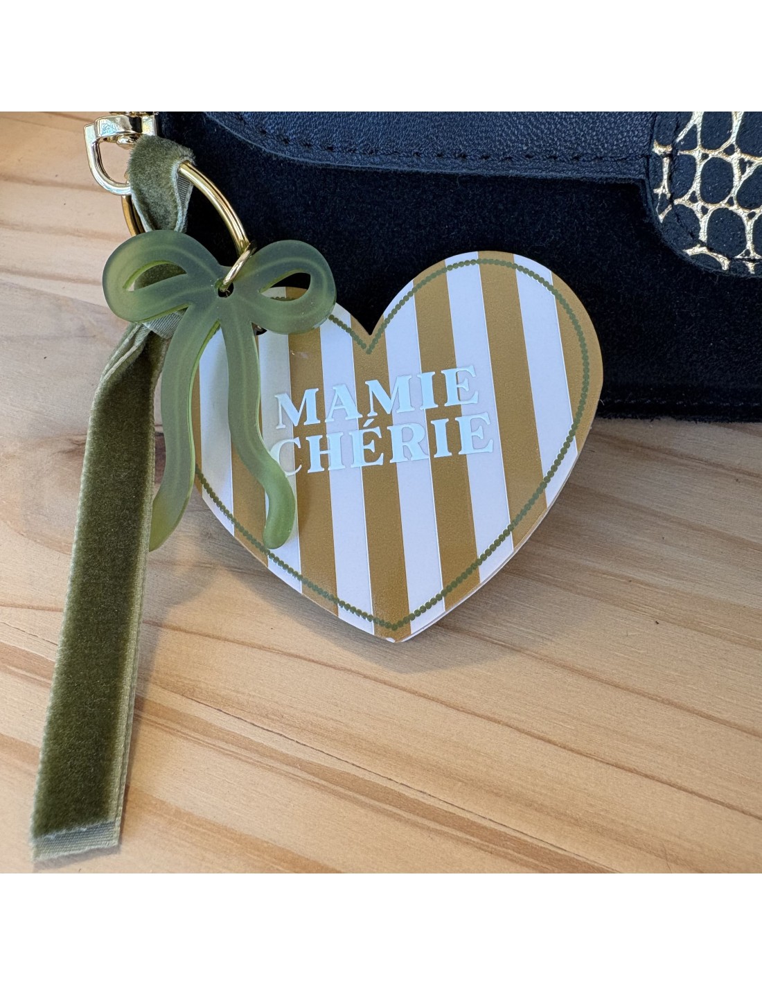 Le porte-clés cœur de la marque Les Mignonneries est élégant et féminin. Il est orné de bandes colorées dans les tons marron et d’une inscription "Mamie chérie" sur le recto. Au verso, un miroir pratique pour les retouches du quotidien.