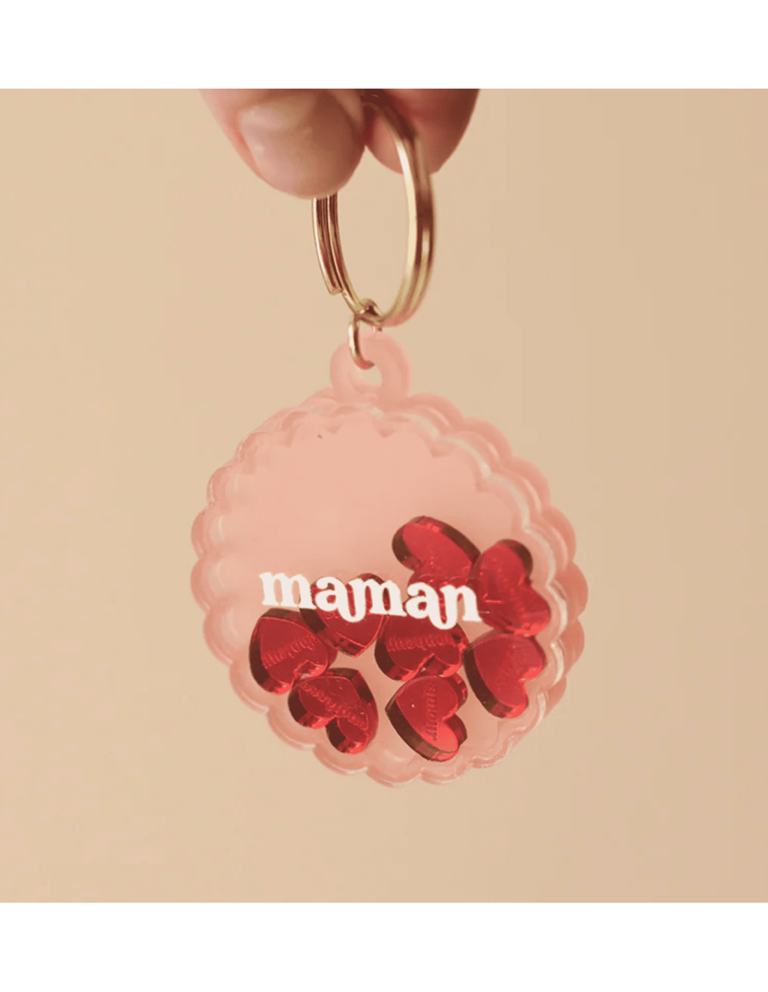 Le porte-clés "shaker" de la marque Les Mignonneries est dédiée aux mamans. Il est en plexiglas givré coloré de rose et rempli de coeurs rouges acidulés.