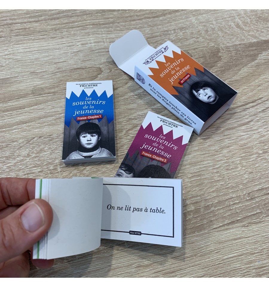 Trois carnets divisés par chapitre (un bleu, un vert et le dernier mauve) qui repertorient les phrases cultes entendues au moins une fois dans votre jeunesse !