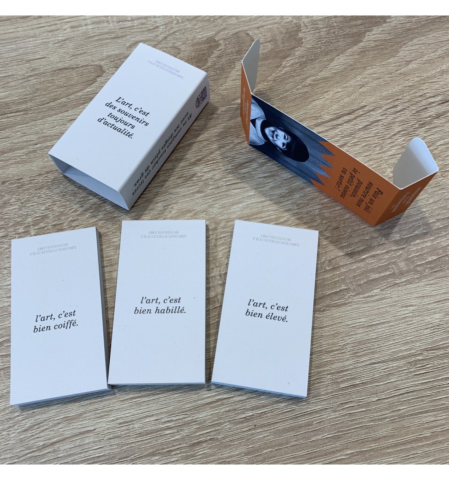 "Les carnets fumigineux" (Fume-je? Fumes-tu? Fume-t-on?) composés d'étiquettes détachables à mettre sur son paquet ou près du cendrier pour méditer sur des idées fumeuses telle que "Le spermatozoïde du fumeur a les dents jaunes".
