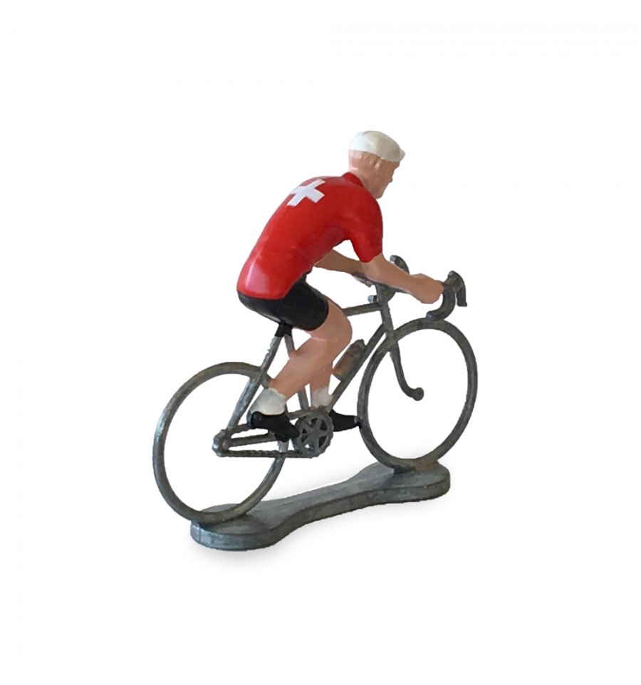 Cette figurine en métal représente un cycliste portant le maillot de la Suisse.