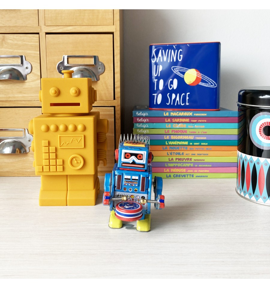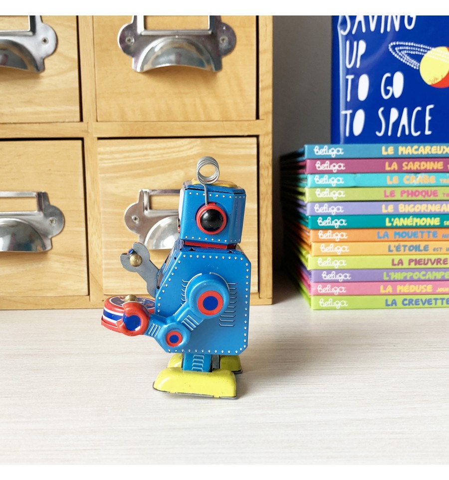 Vintage à souhait, ce petit robot mécanique en métal avance quand on le remonte avec une clé.