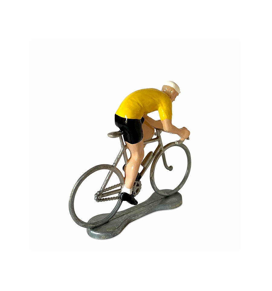 Cette figurine en métal représente un cycliste portant le maillot jaune du Tour de France en position de Sprinter.