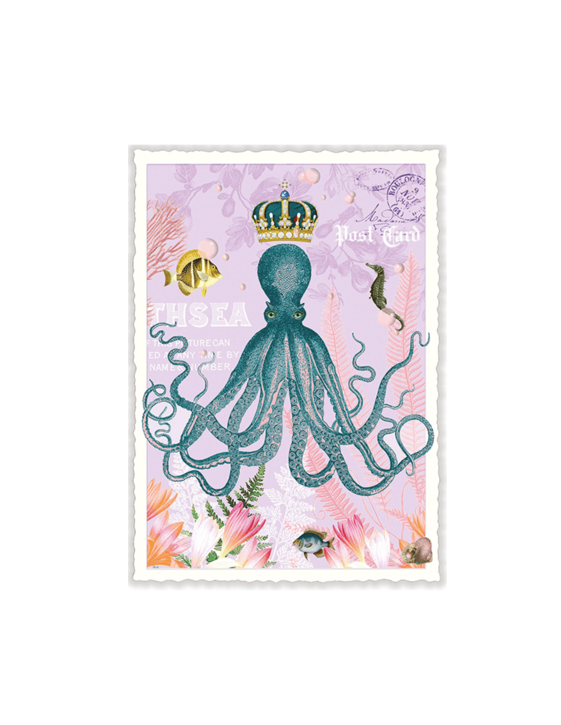 Découvrez sur cette jolie carte un poulpe qui porte une couronne, avec ses yeux vert bouteille il est entouré d'un poison jaune et d'un hippocampe curieux. Ses tentacules recouvrent la carte délicatement violette, on adore les détails fleuris et pailletés qui en font une carte un peu "au delà du kitch" et vous savez quoi..? On adore ça !!!