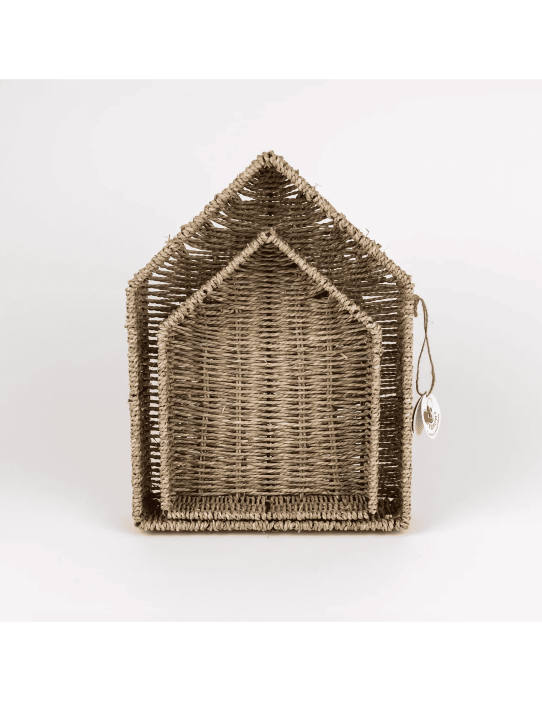 Découvrez un duo d'étagère en osier en forme de maison à installer partout chez vous.
