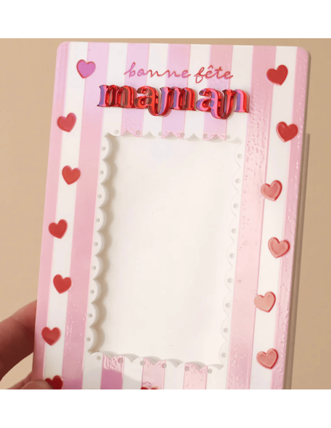 Grâce à son format magnétique, il peut être facilement placé sur un réfrigérateur ou toute surface métallique, permettant d’exposer une photo ou un petit mot rempli d’amour au quotidien.