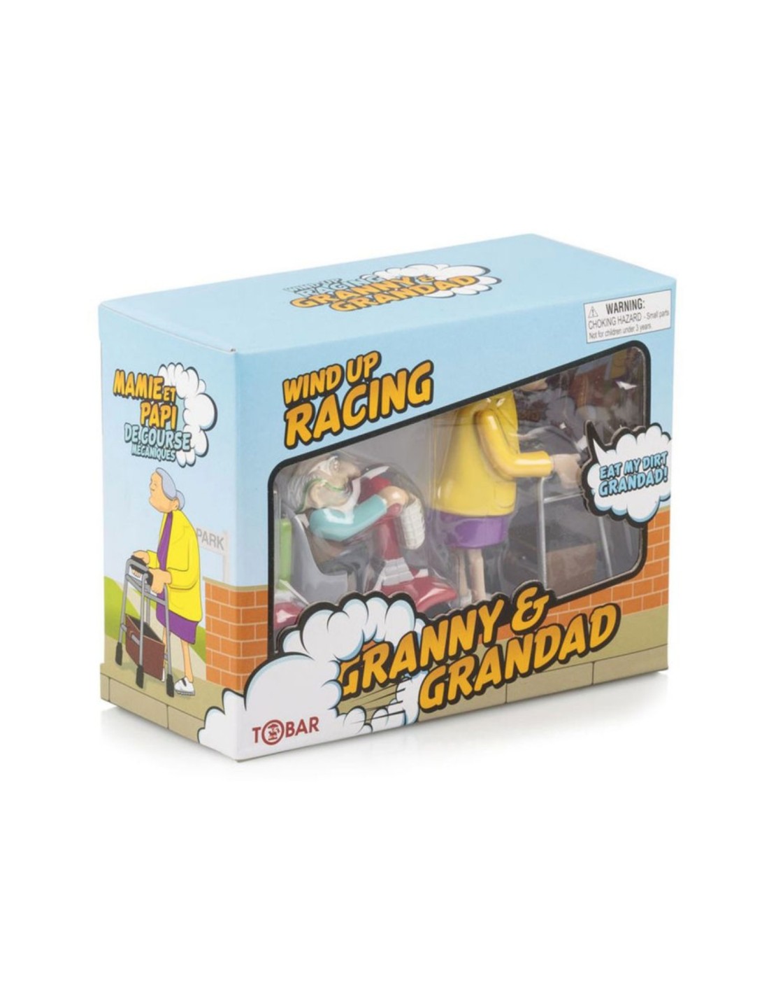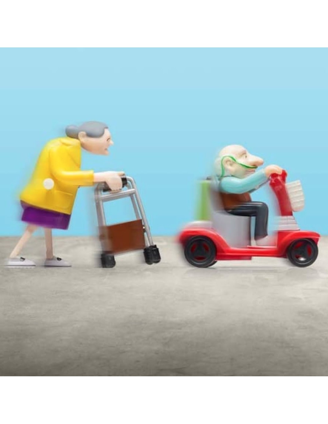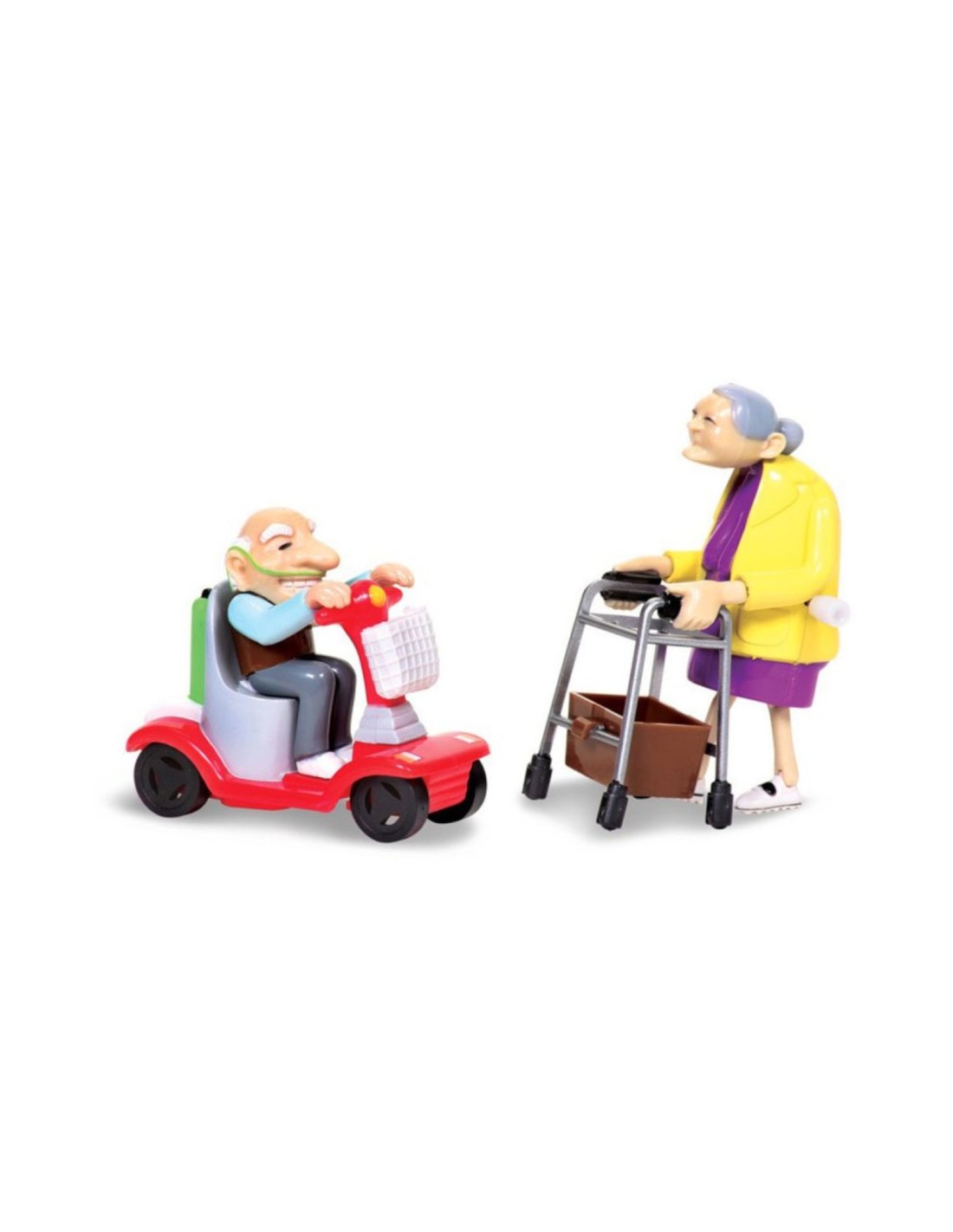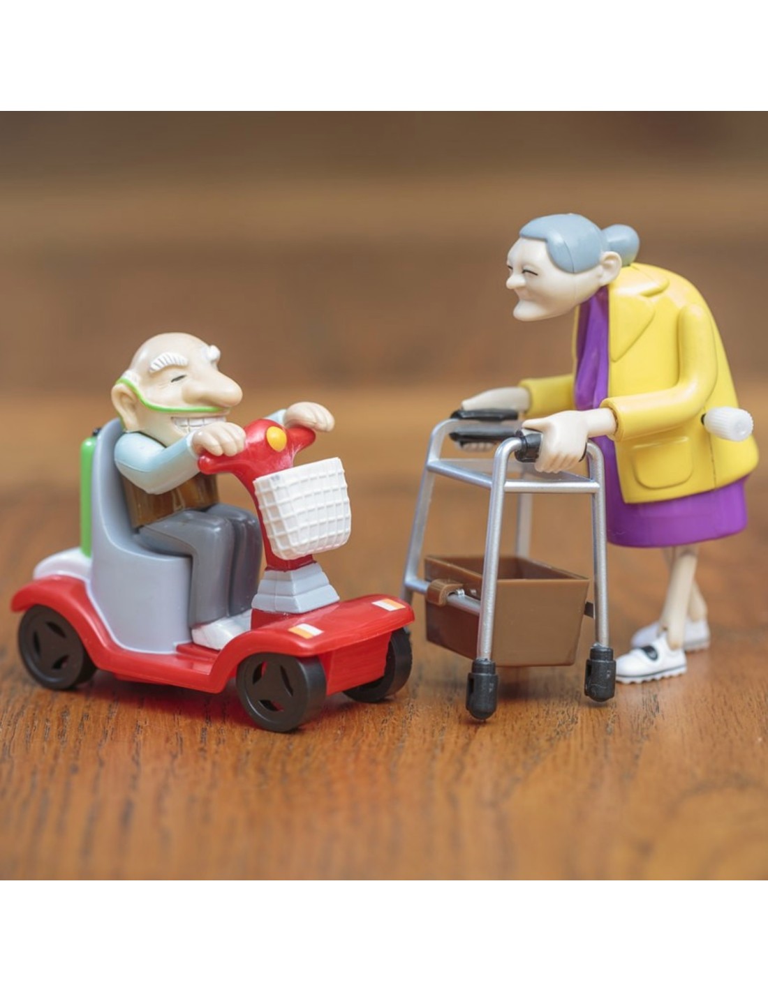 Ce jeu mécanique contient une mamie avec son déambulateur "à remonter" et un papi sur son fauteuil roulant à friction.