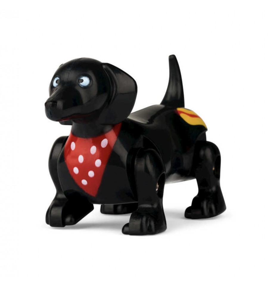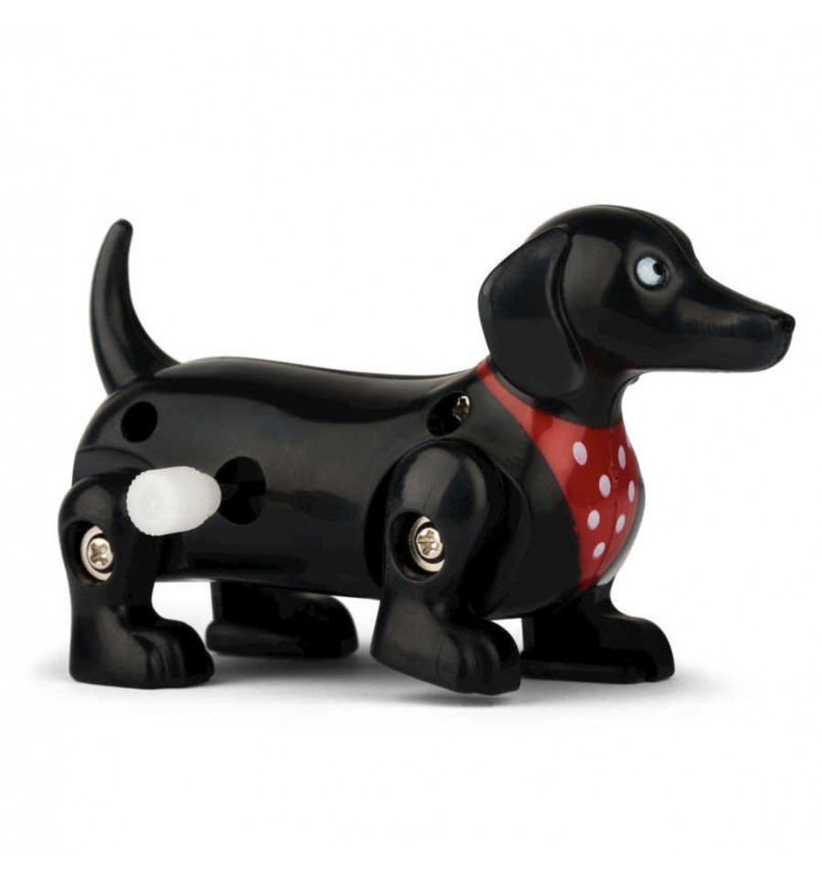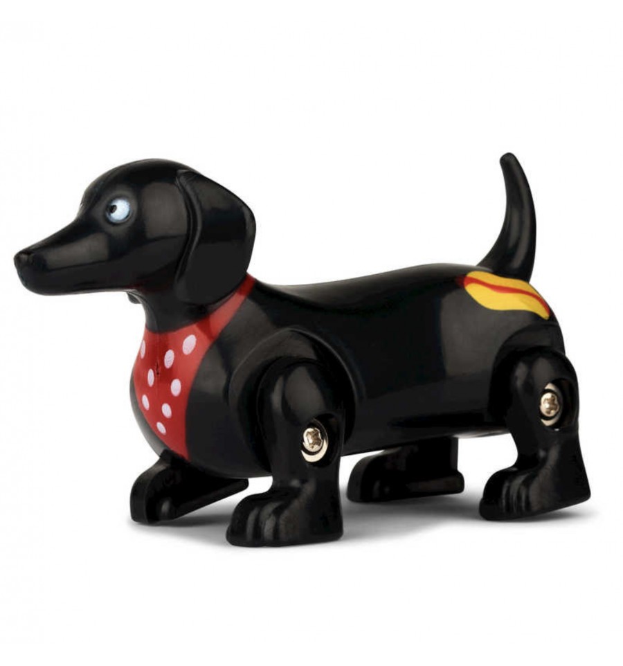 Ce teckel est doté d'un mécanisme simple à remonter, une petite molette à tourner qui lui permet de se déplacer joyeusement dès qu'on lui donne un peu d'élan.