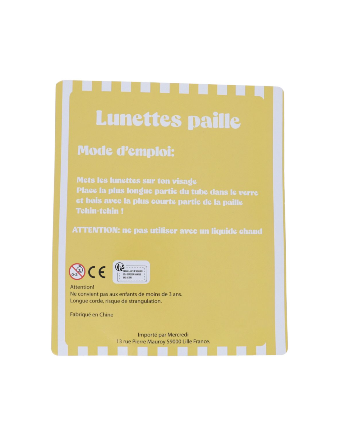 D'assemblage très simple. Une fois les lunettes sur le nez, vous plongez la partie de la paille la plus longue dans votre verre et prenez la plus courte dans votre bouche. Voilà ! Maintenant il vous suffit de déguster votre boisson sous le regard amusé de vos amis !