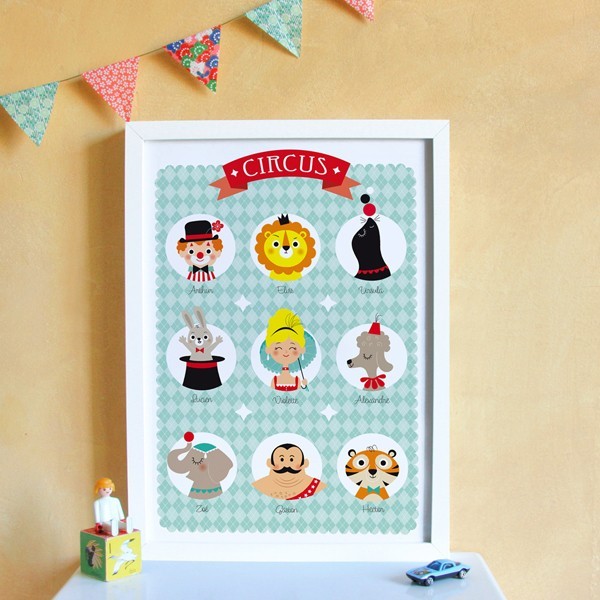 Une belle affiche illustrée par Zü avec les potrtaits de l'extraordinaire troupe du cirque composée d'Arthur le Clown, Elvis le Lion, Ursula l'Otarie, Lucien le Lapin chapeau, Violette la Funambule, Alexandre le Chien savant, Zoé l'éléphante, Gaston le Porteur, et Hector le Tigre.