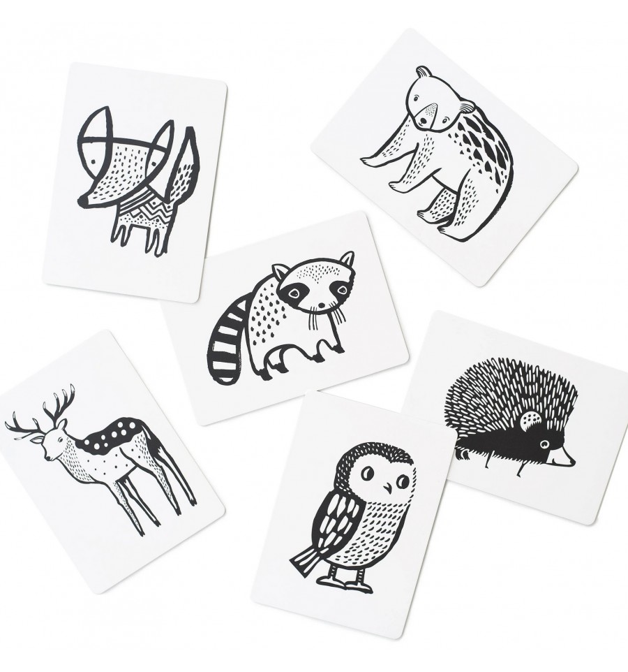 Les cartes représentent les animaux emblématiques de la forêt : l'ours, le renard, la chouette, le hérisson, le raton laveur et le cerf.