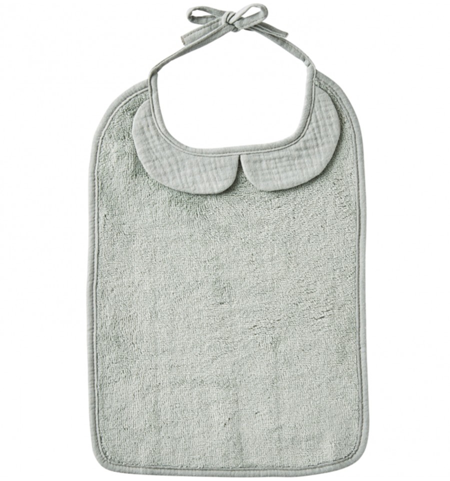 Ce grand bavoir à col Vert de gris accompagnera bébé à l'heure des repas.