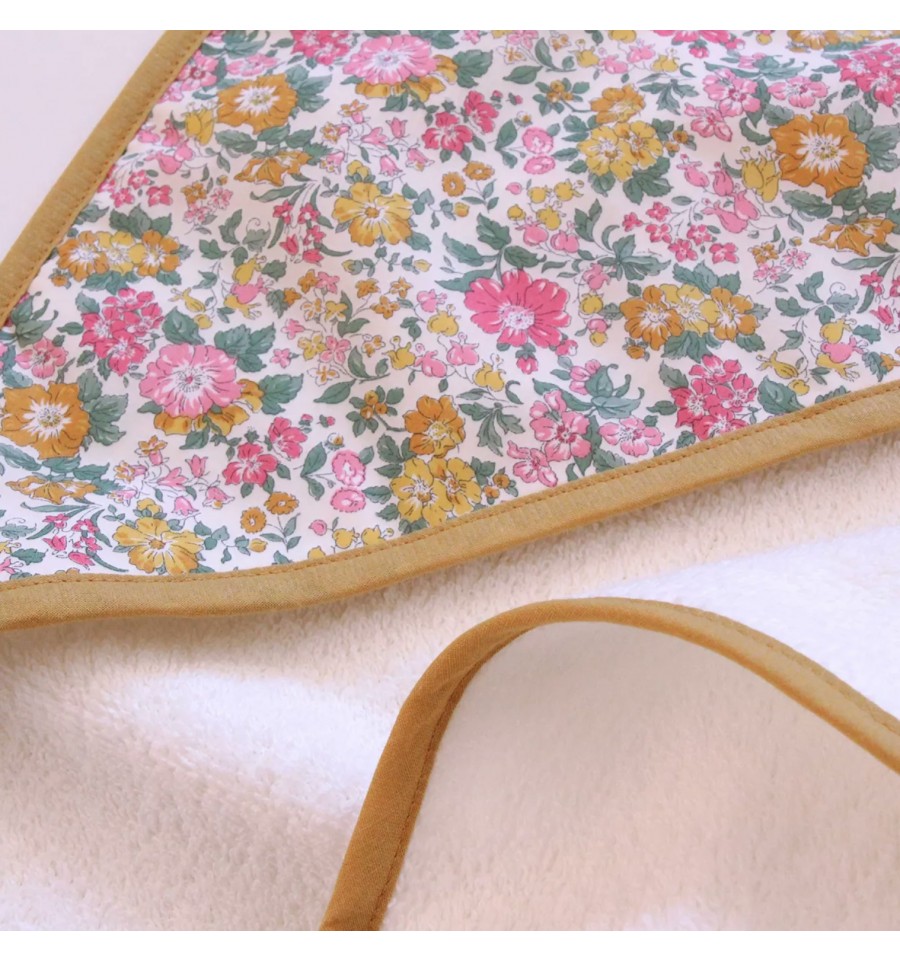 Matières : bouclette éponge Oeko-tex 430 gr/m2 90% coton + 10% polyester, capuche en tissu Liberty 100 coton.
