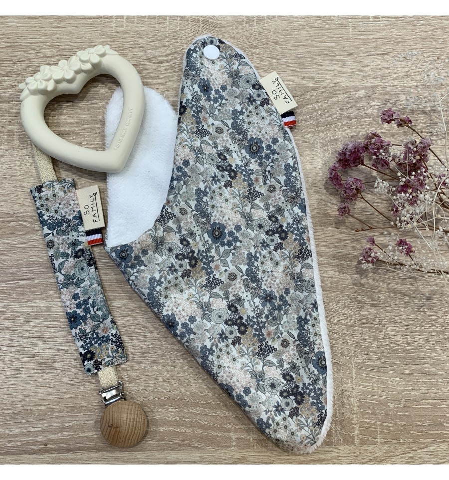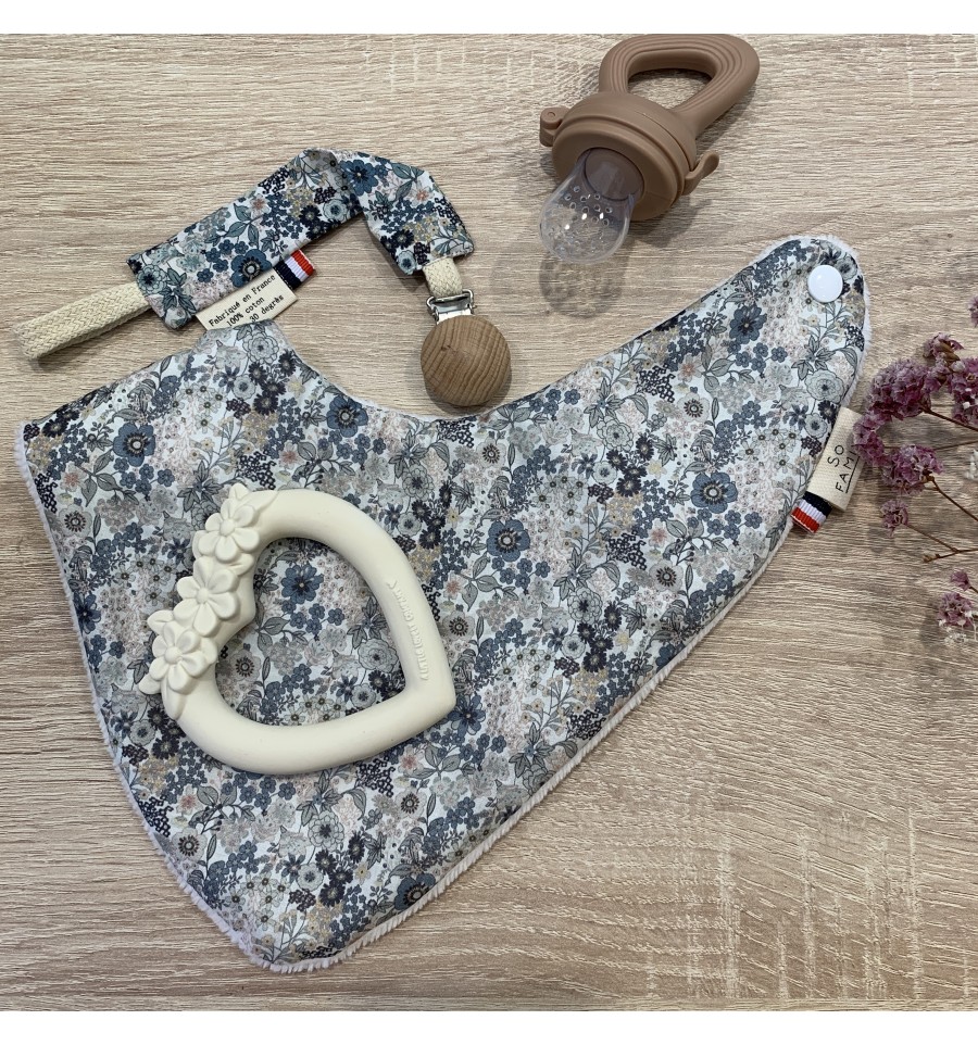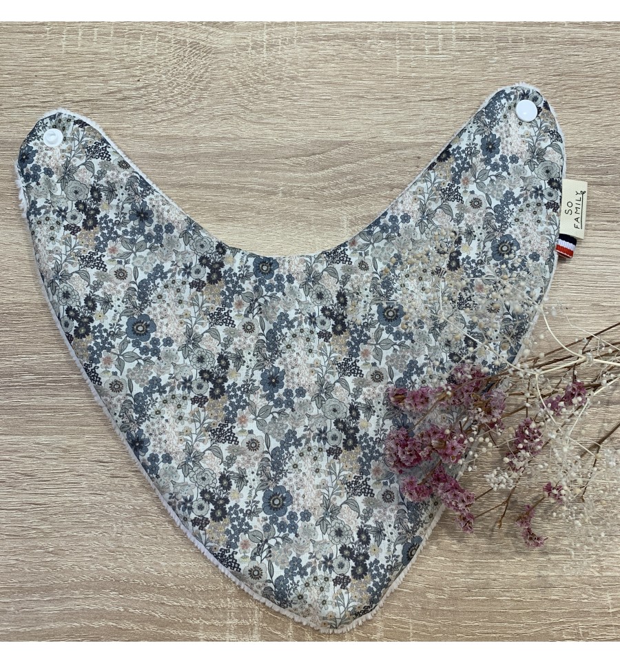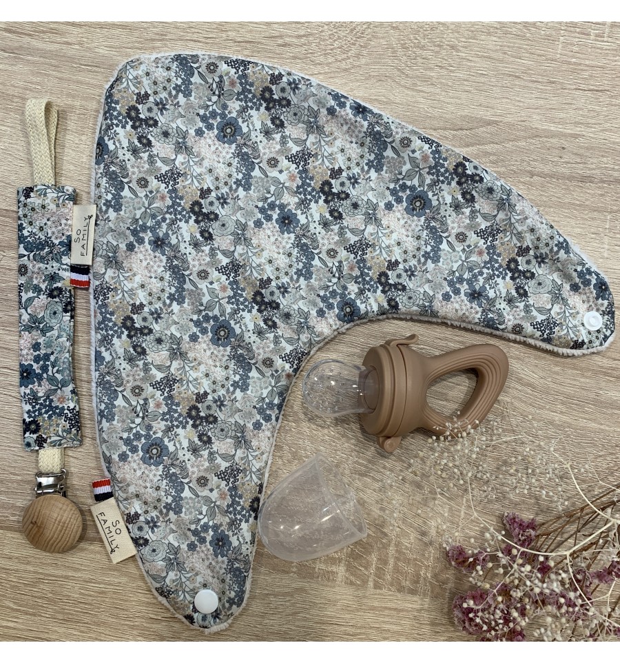 En gaze de coton à l'extérieur, et en éponge de bambou bio à l'intérieur, il est très souple et très doux. Le bavoir se ferme autour du cou de bébé grâce à des boutons de pression.