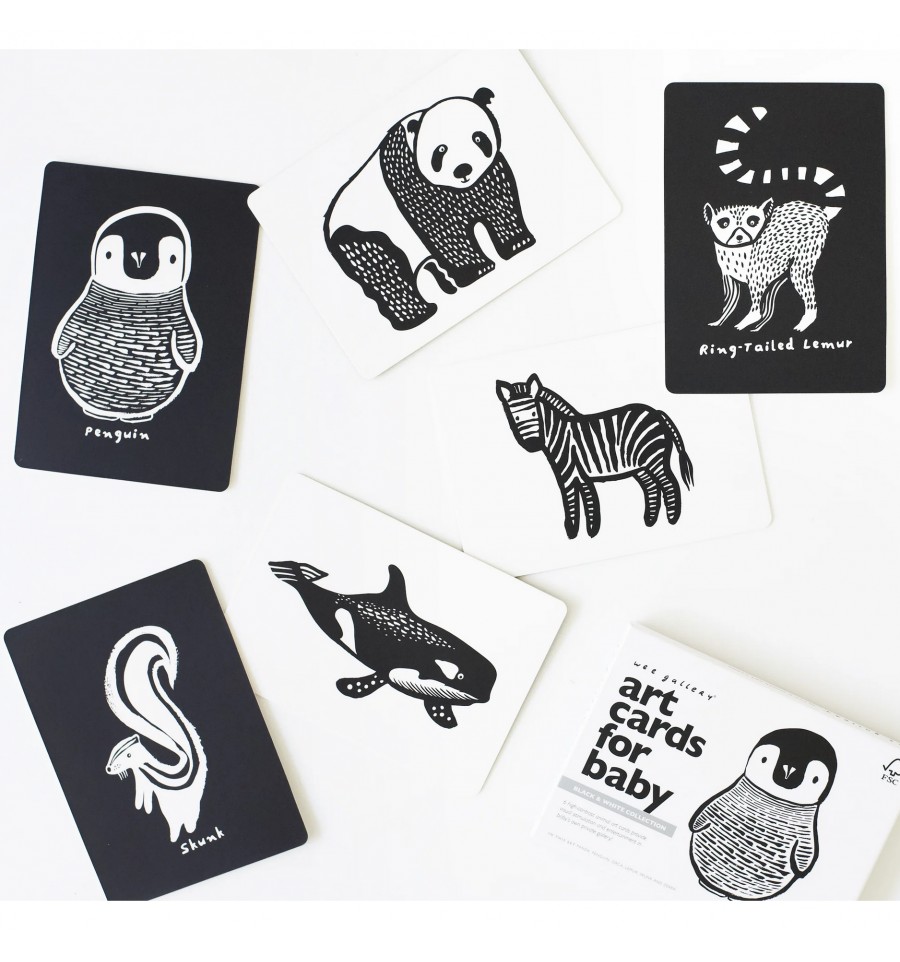 Les cartes représentent les animaux noir et blanc les plus connus : l'orque, le lémurien, le pingouin, la moufette, l'ours et le zèbre.
