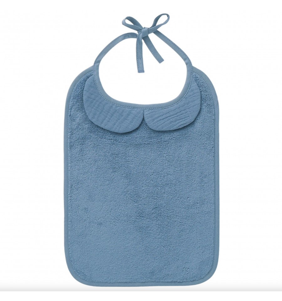 Ce grand bavoir à col d'un bleu magnifique, accompagnera bébé à l'heure des repas.
