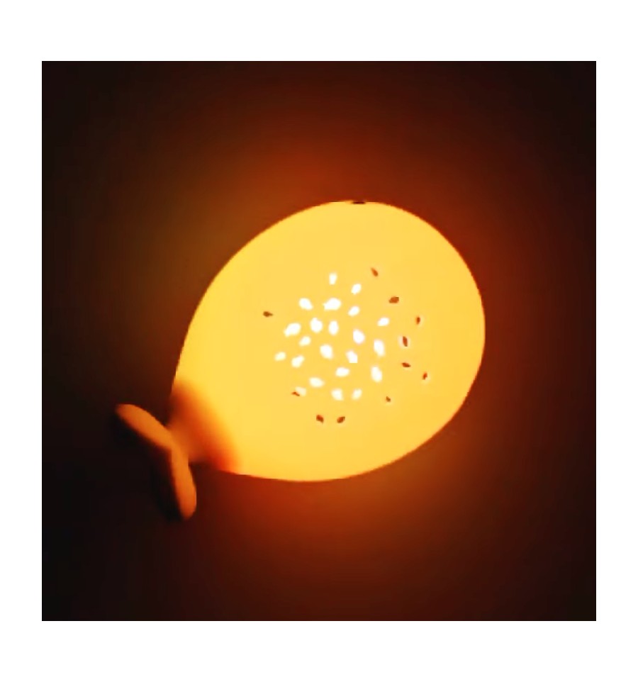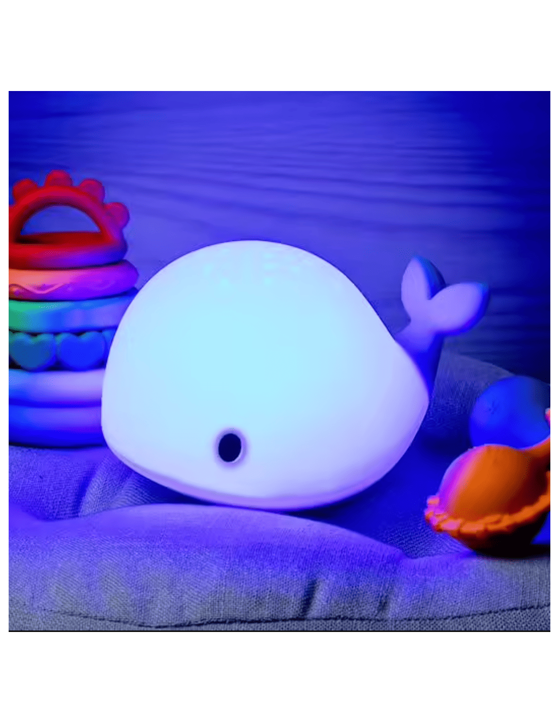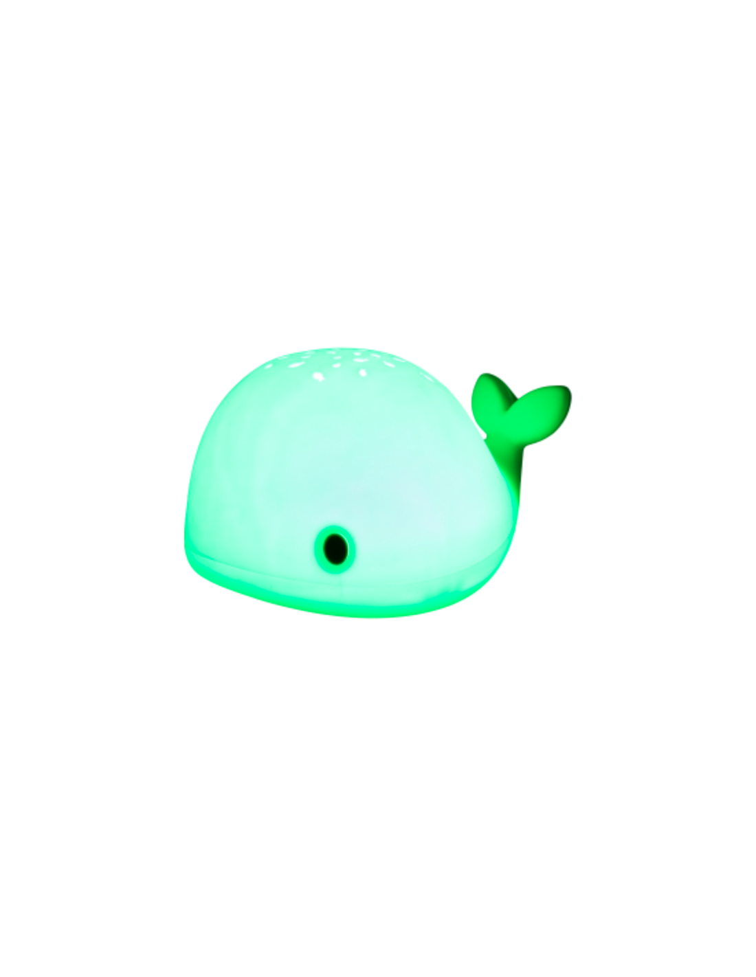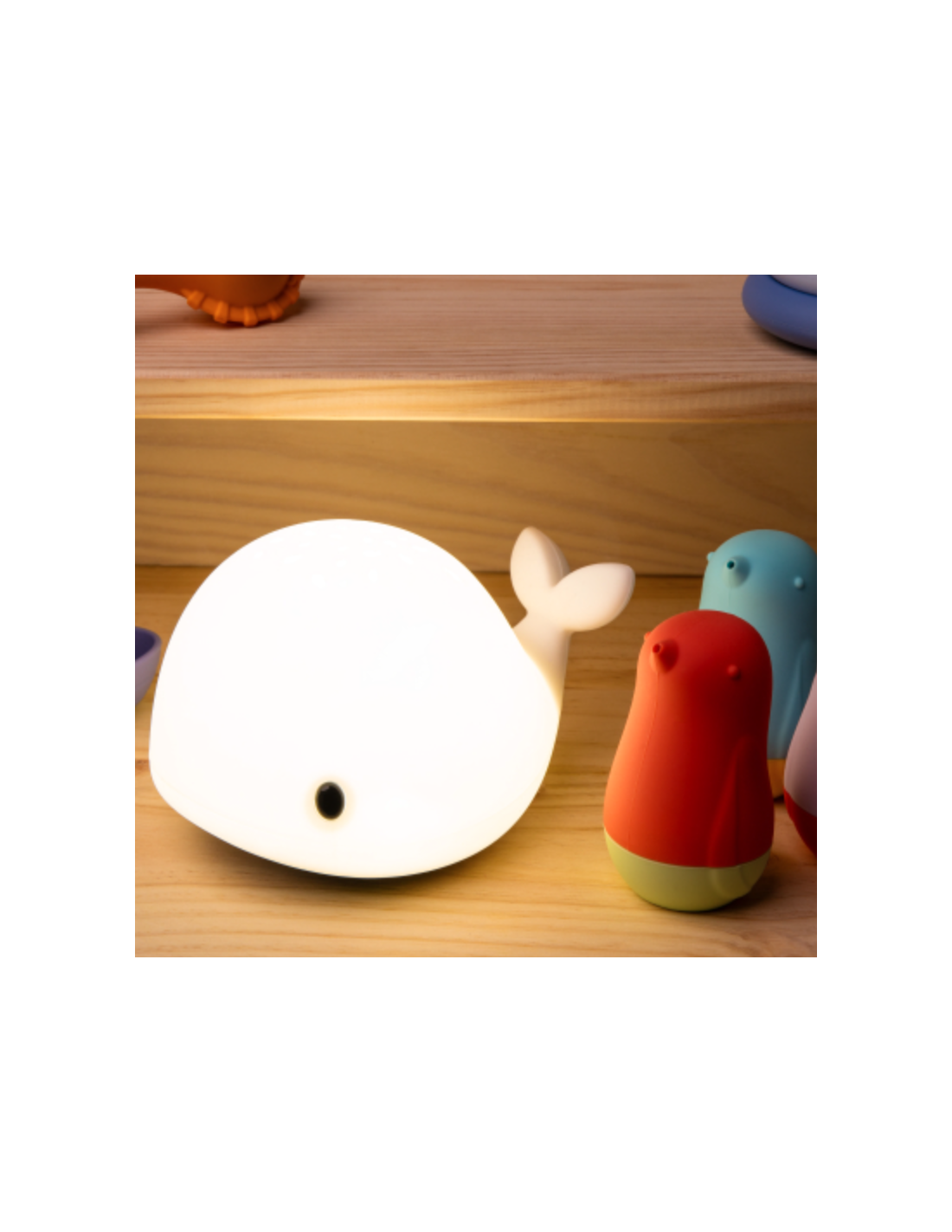 - 6 tonalités lumineuses différentes (blanc, rouge, jaune, vert, bleu, rose et orange) , projection de poissons et de baleines sur le dessus de la veilleuse.