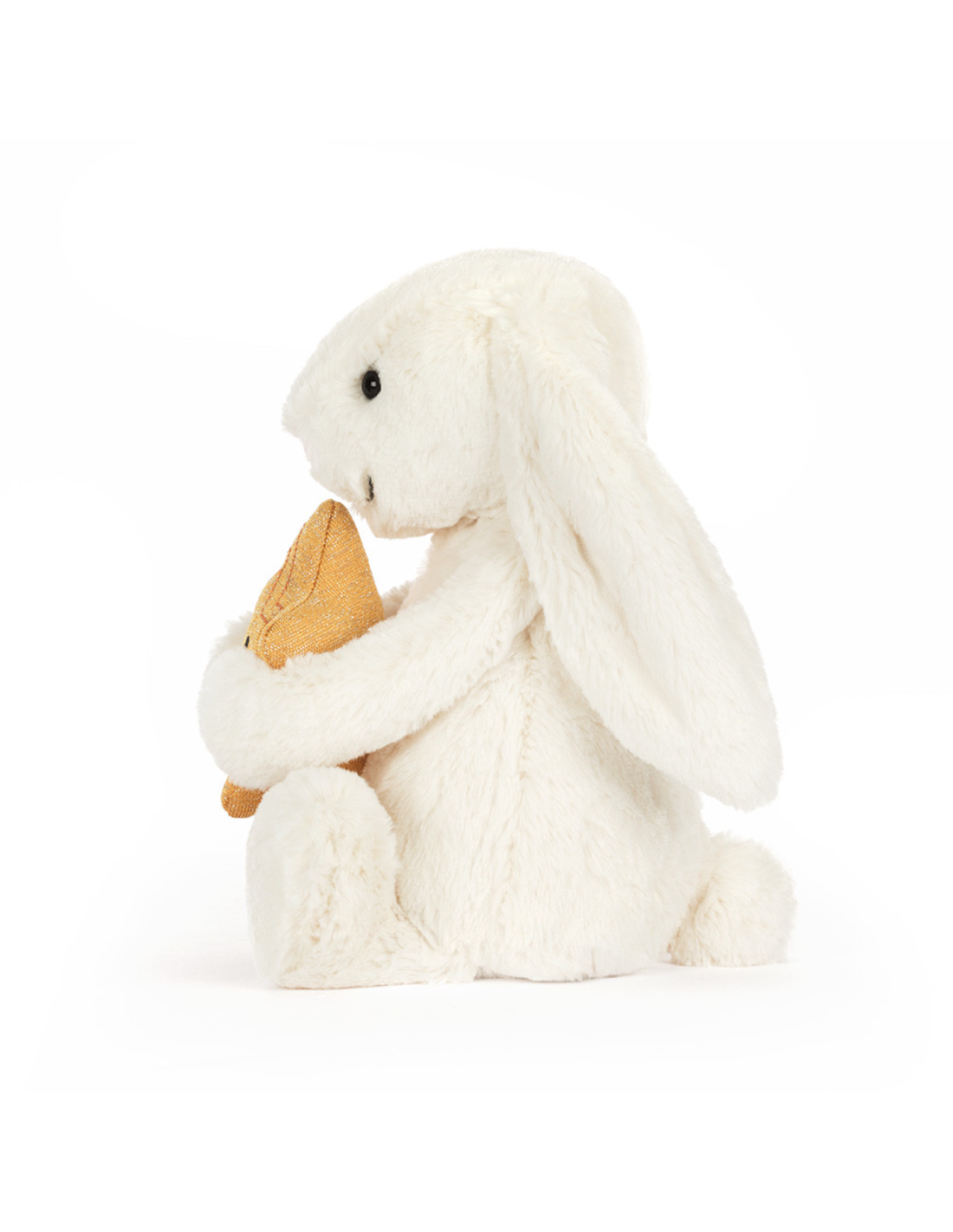 Cette peluche lapin Jellycat tout blanc "Cream Bunny with Star" qui serre contre lui une étoile dorée brillante ravira petits et grands.