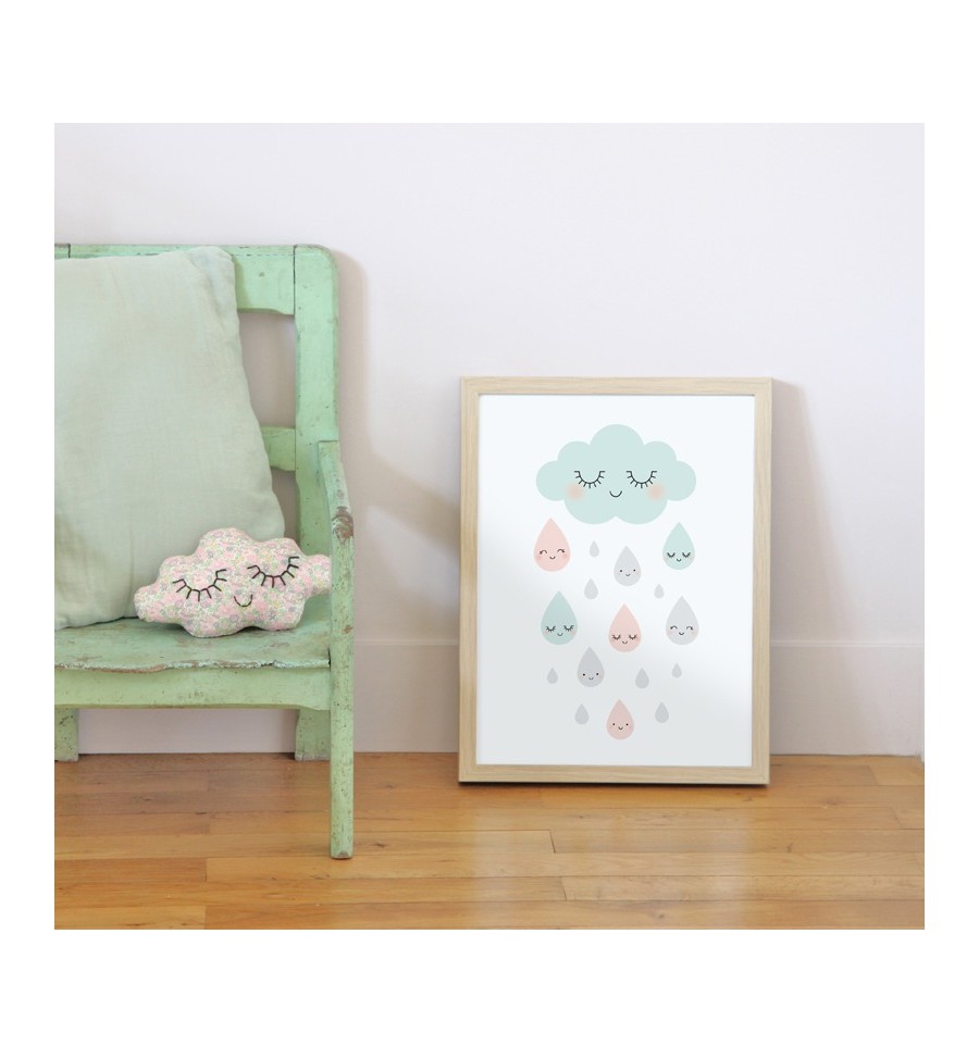 L'affiche douce pluie de Zü, avec le célèbre nuage aux yeux fermés et au sourire radieux de la créatrice qui décore la chambre dans des teintes pastel très actuelles.