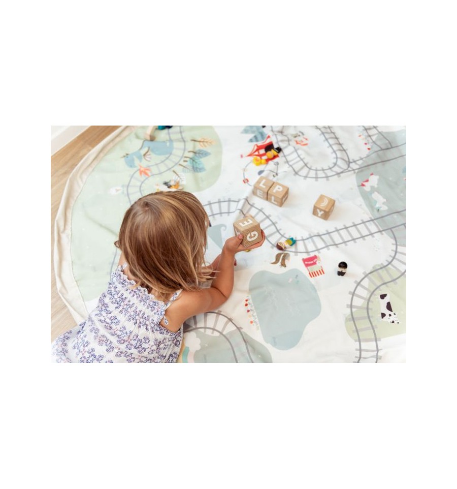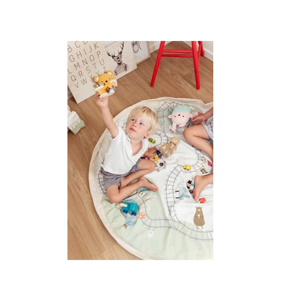 Le sac de rangement en forme de baluchon est un sac bien pratique pour jouer et ranger! Avec ce sac Play and go, l'enfant pourra étaler tous ses jouets et tout ramasser d'un tour de main. Sa version imprimée recto- verso avec ses ours d'un côté et un circuit de train à l'intérieur.