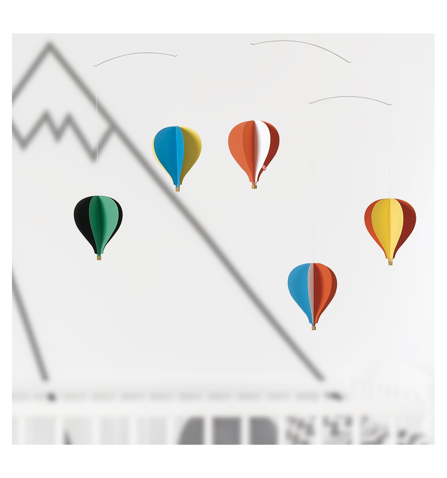 Ce mobile de chez Flensted est inspiré par les Montgolfières du 18ème siècle et des ballons à air chaud modernes d’aujourd’hui. Une plaque retraçant l’histoire des Montgolfières célèbres, de 1783 à 1978, terminant avec le « Double Eagle II » est incluse dans la boite.