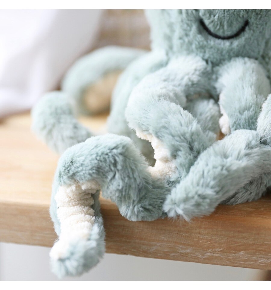 Une peluche pieuvre avec ses grandes tentacules toutes douces, avec lesquelles les enfants aiment jouer.