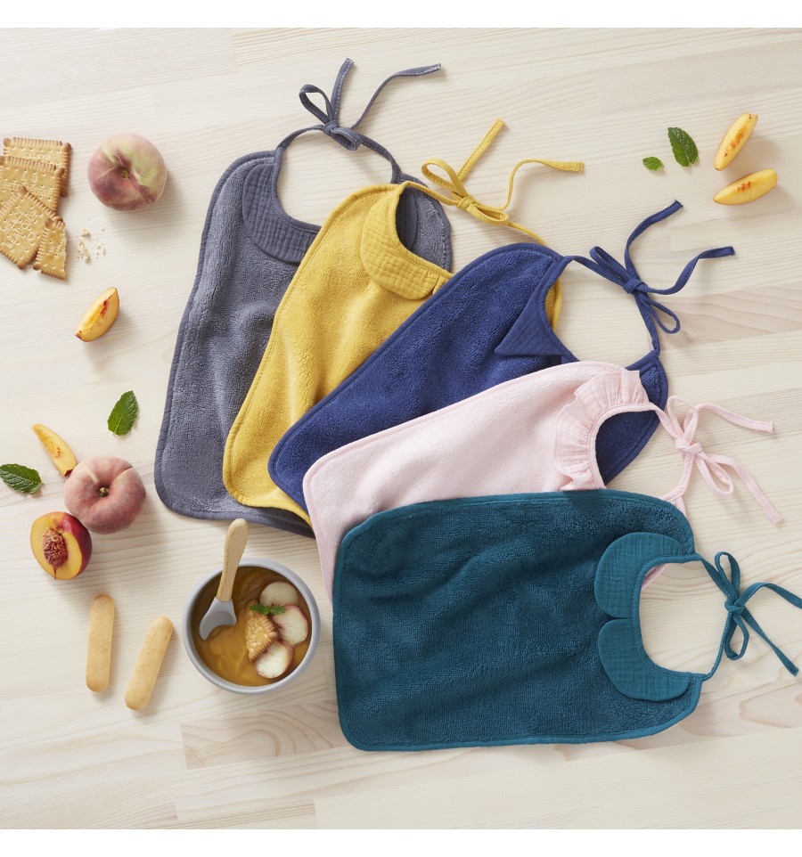 Ce grand bavoir se noue facilement autour de cou de bébé pour protéger ses vêtements au moment des repas.