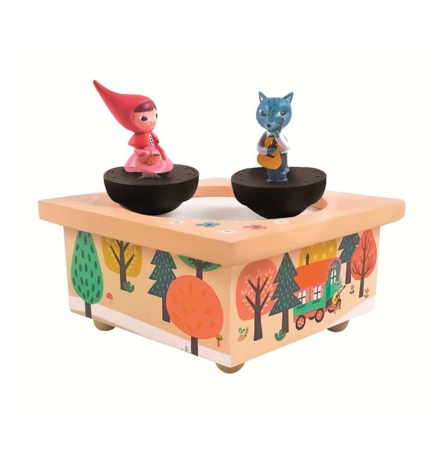 Cette boîte à musique Trousselier en bois s'anime avec le Petit Chaperon Rouge et le loup qui se déplacent et tournent sur eux-mêmes au son de la musique remontée par une clef.