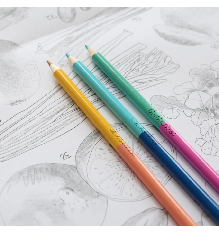3 crayons double mine, avec une prise en main parfaite pour dessiner, écrire, esquisser (et presque trop jolis pour être taillés). Ils se glissent facilement dans la trousse pour l'école, dans un sac de voyage pour s'occuper dans le train...