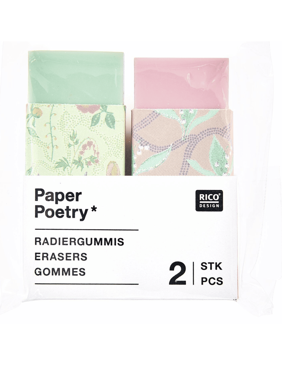 Set de 2 gommes colorées = une gomme vert d'eau et une rose clair, elles sont entourées toutes les deux d'un petit fourreau fleuri.