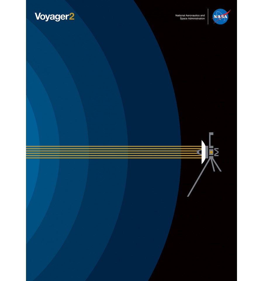 Cette affiche consacrée à la mission spatiale Voyager 2, affirme son style rétrofuturiste, entre science-fiction et prospective.