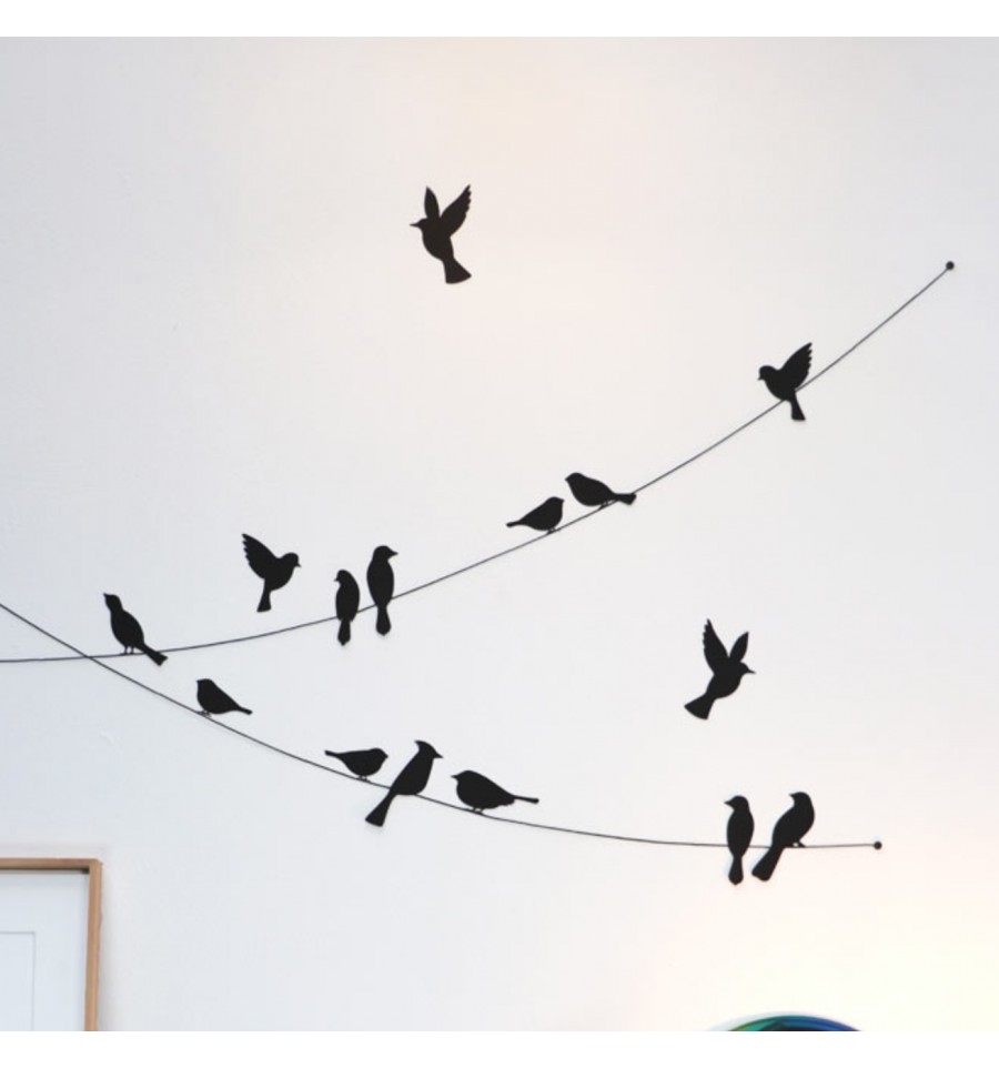 Cette pochette contient 22 silhouettes d'oiseaux noirs de différentes tailles et formes ainsi qu'un fil de coton noir et des pastilles adhésives.