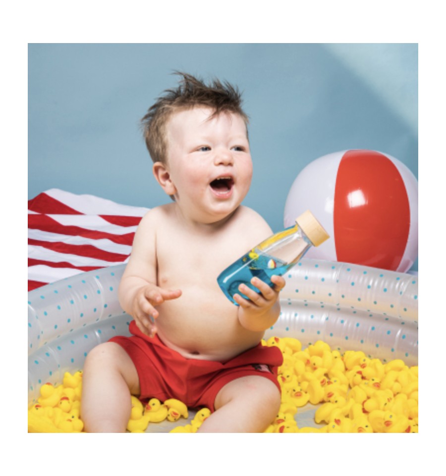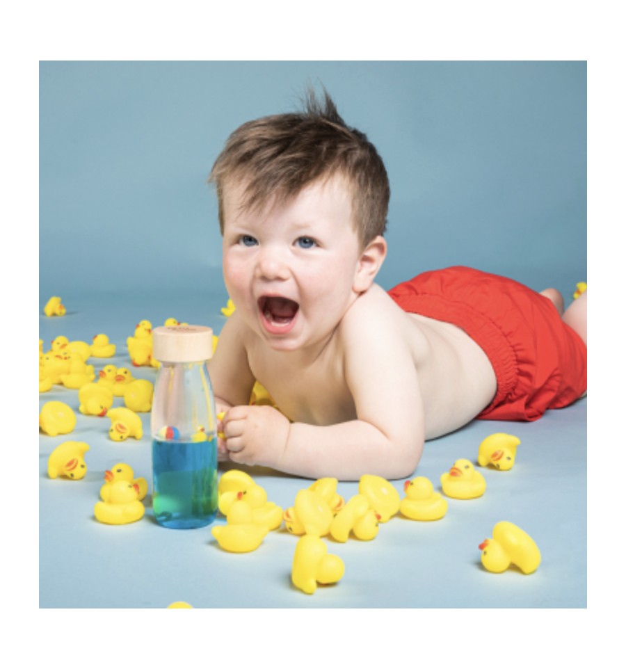Inspirée de la pédagogie Montessori, cette bouteille sécurisée à double paroi, contient du liquide, un joli petit cannard jaune, un ballon coloré et des paillettes en forme de canard jaune brillant on adoooore !Tout est réuni pour stimuler la vue de votre bébé. Lorsqu'on l'agite, les éléments bougent et brillent de manière magique.