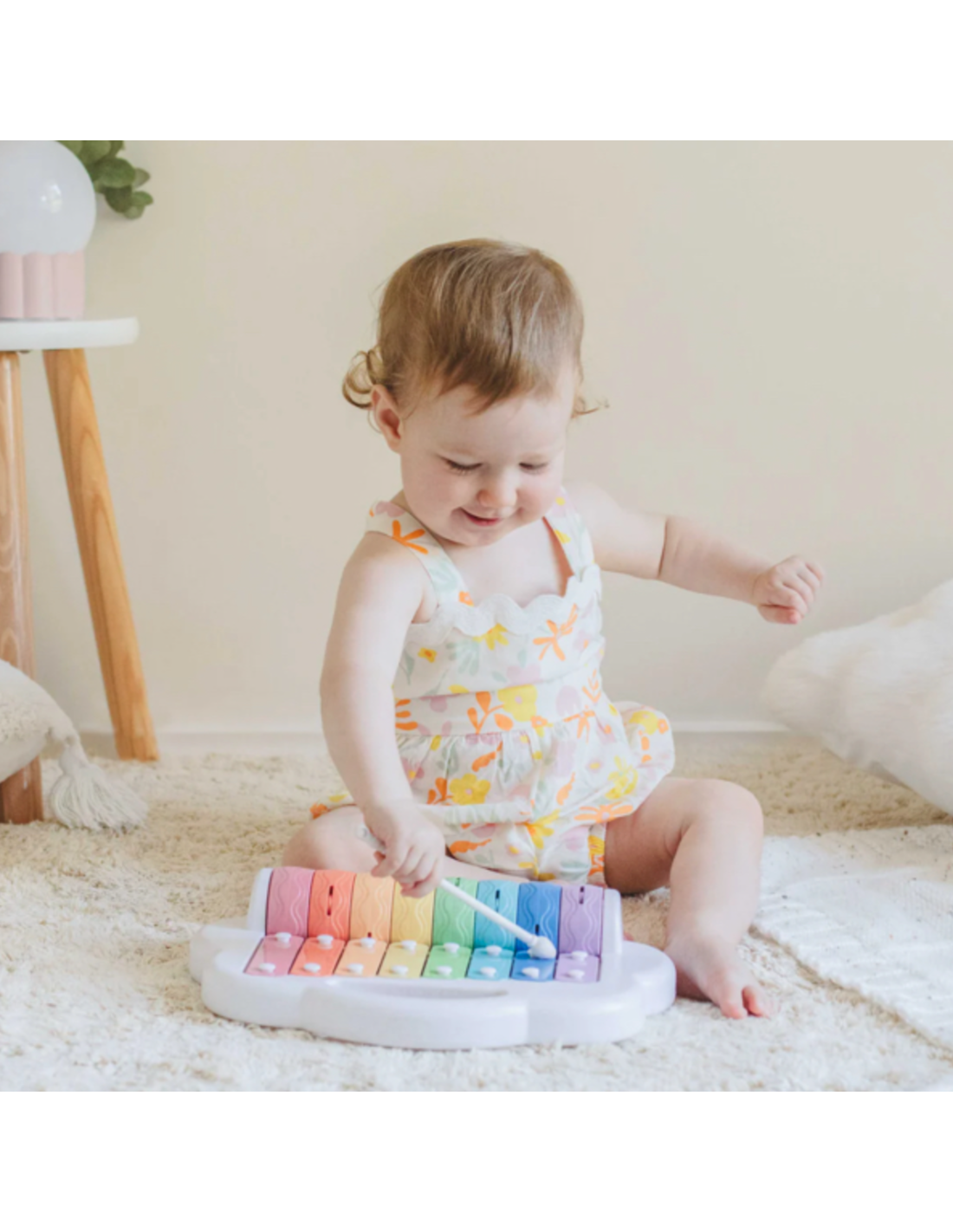 Composé de 8 touches métalliques et de 8 rouleaux aux couleurs de l'arc-en-ciel, ce xylophone en bioplastique, en forme de nuage fera le bonheur de vos petits loups.