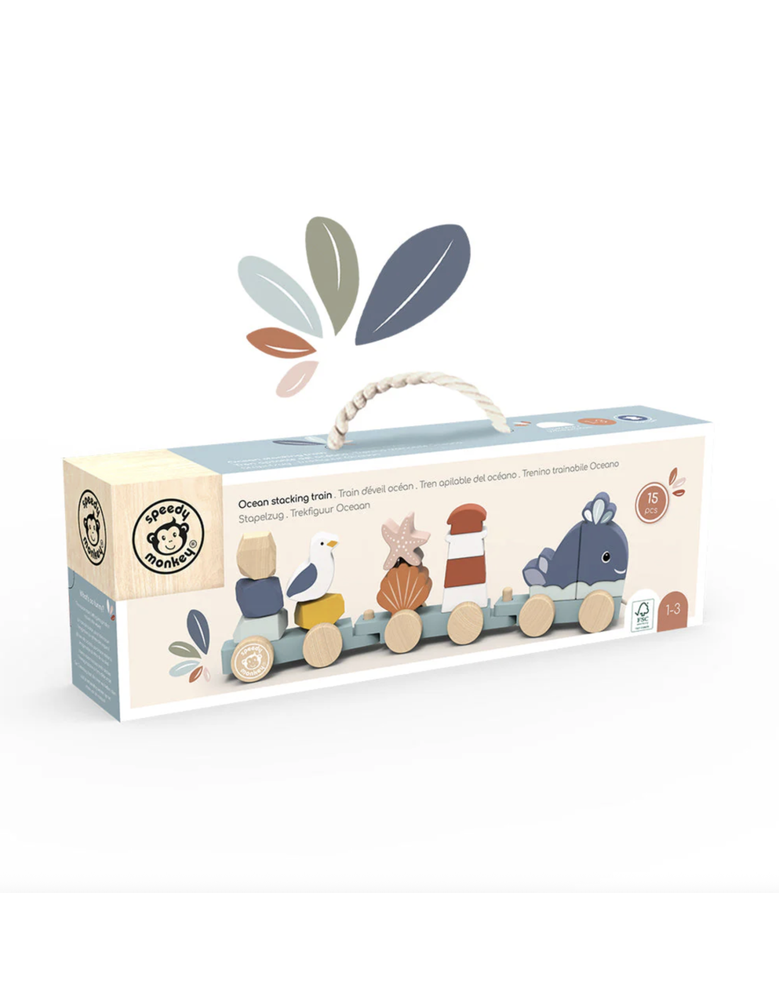 Ce train en bois est aussi composé de 15 blocs de formes et couleurs différentes : une baleine, un phare, une mouette, un coquillage, une étoile de mer, etc... qui voyagent à bord du train et seront les compagnons favoris de votre enfant.
